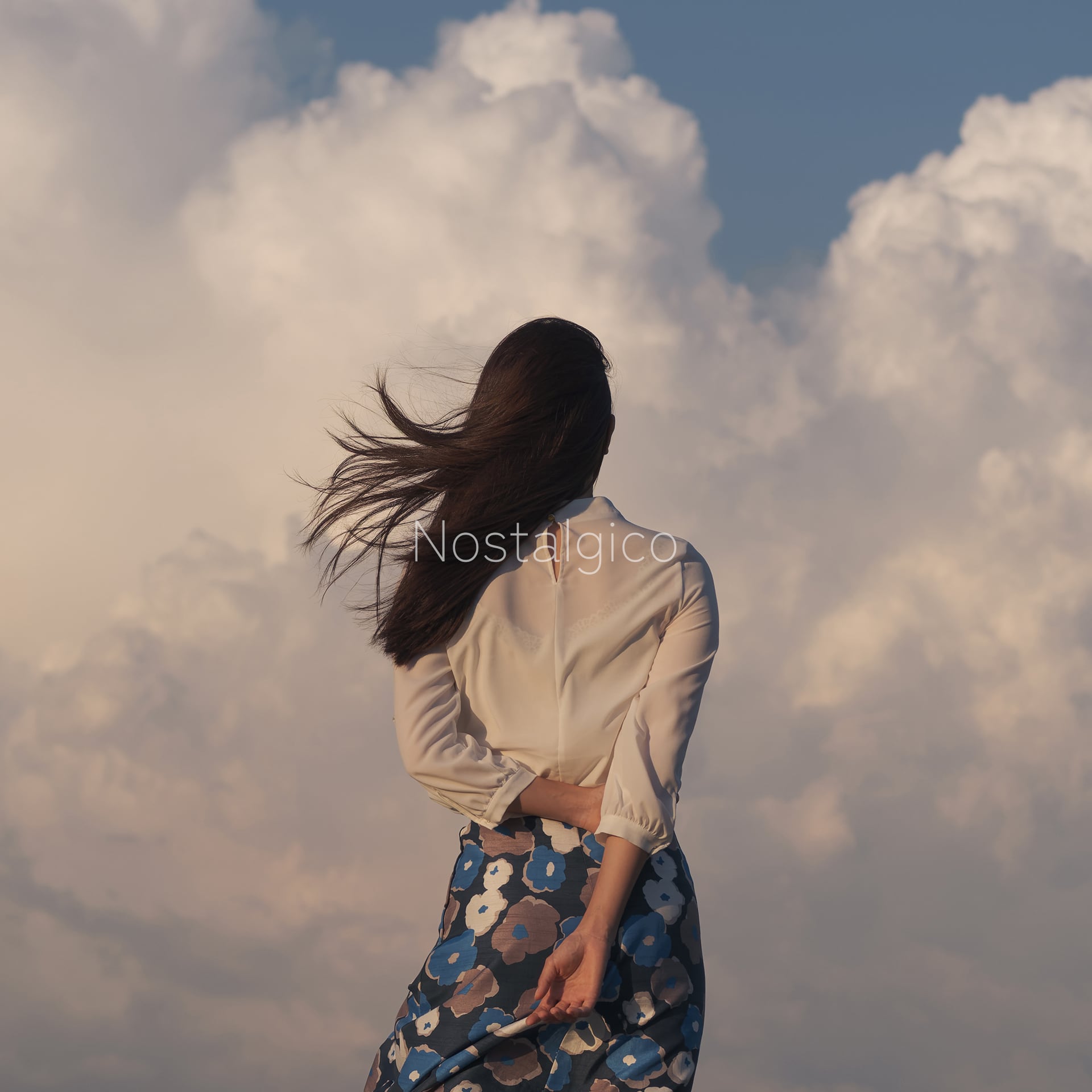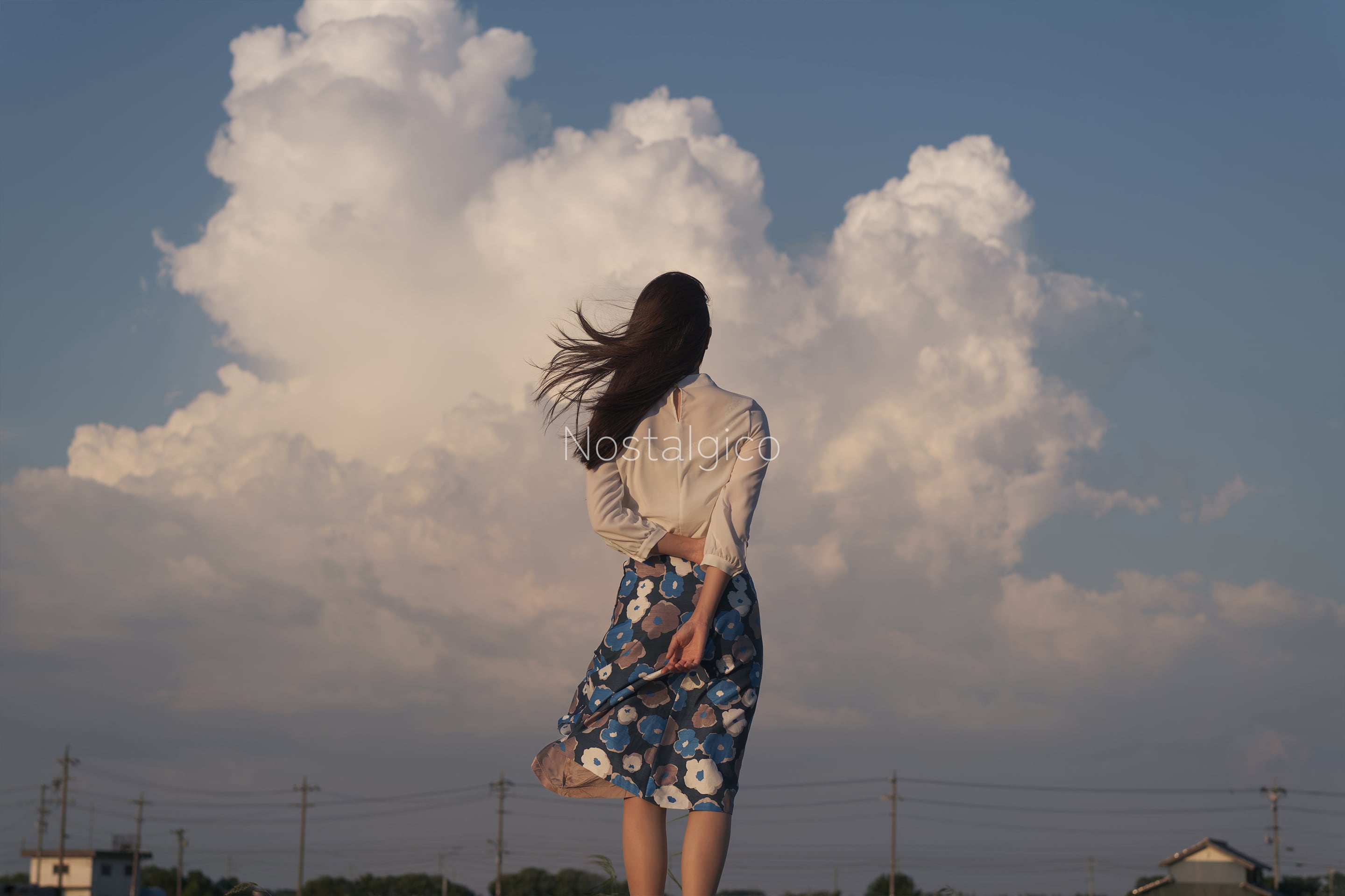 穏やかな夕暮れ時の雄大な雲と女性の優雅な姿が調和し、ロマンチックな雰囲気を醸し出しています。