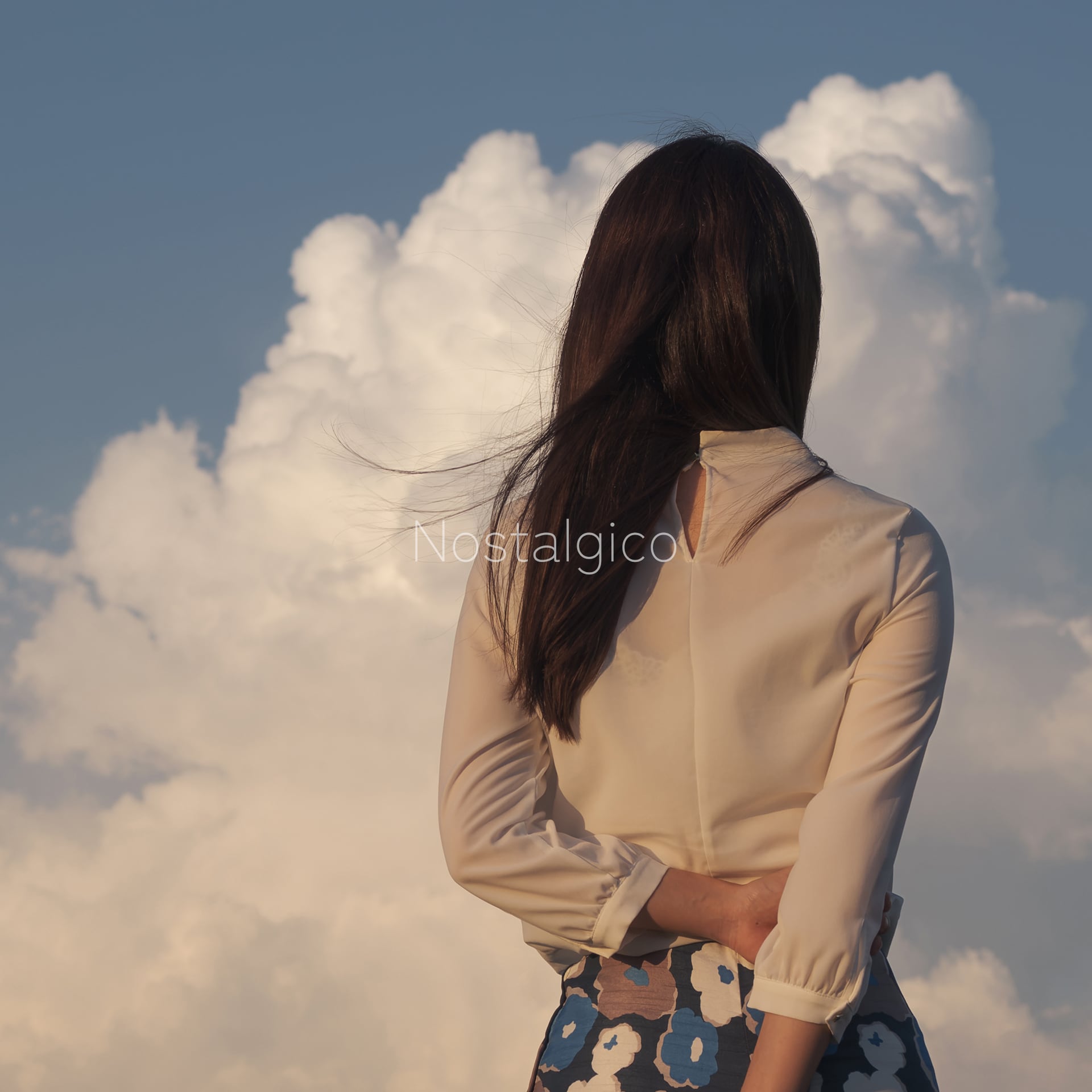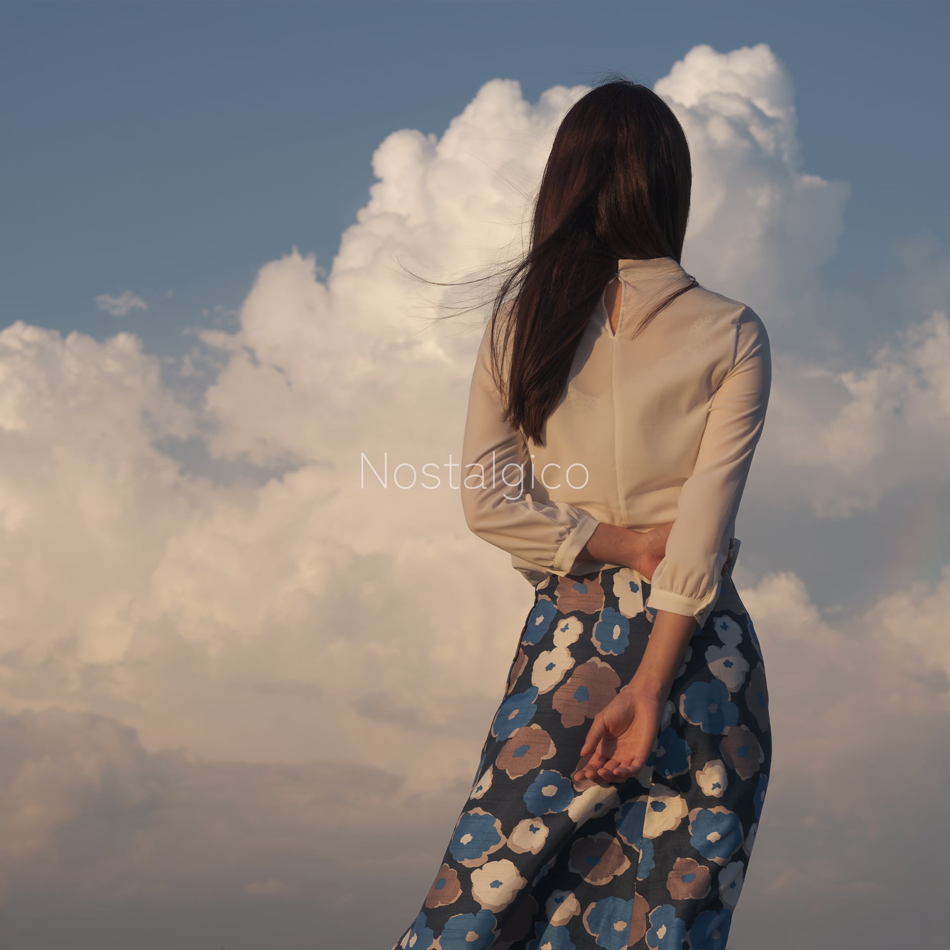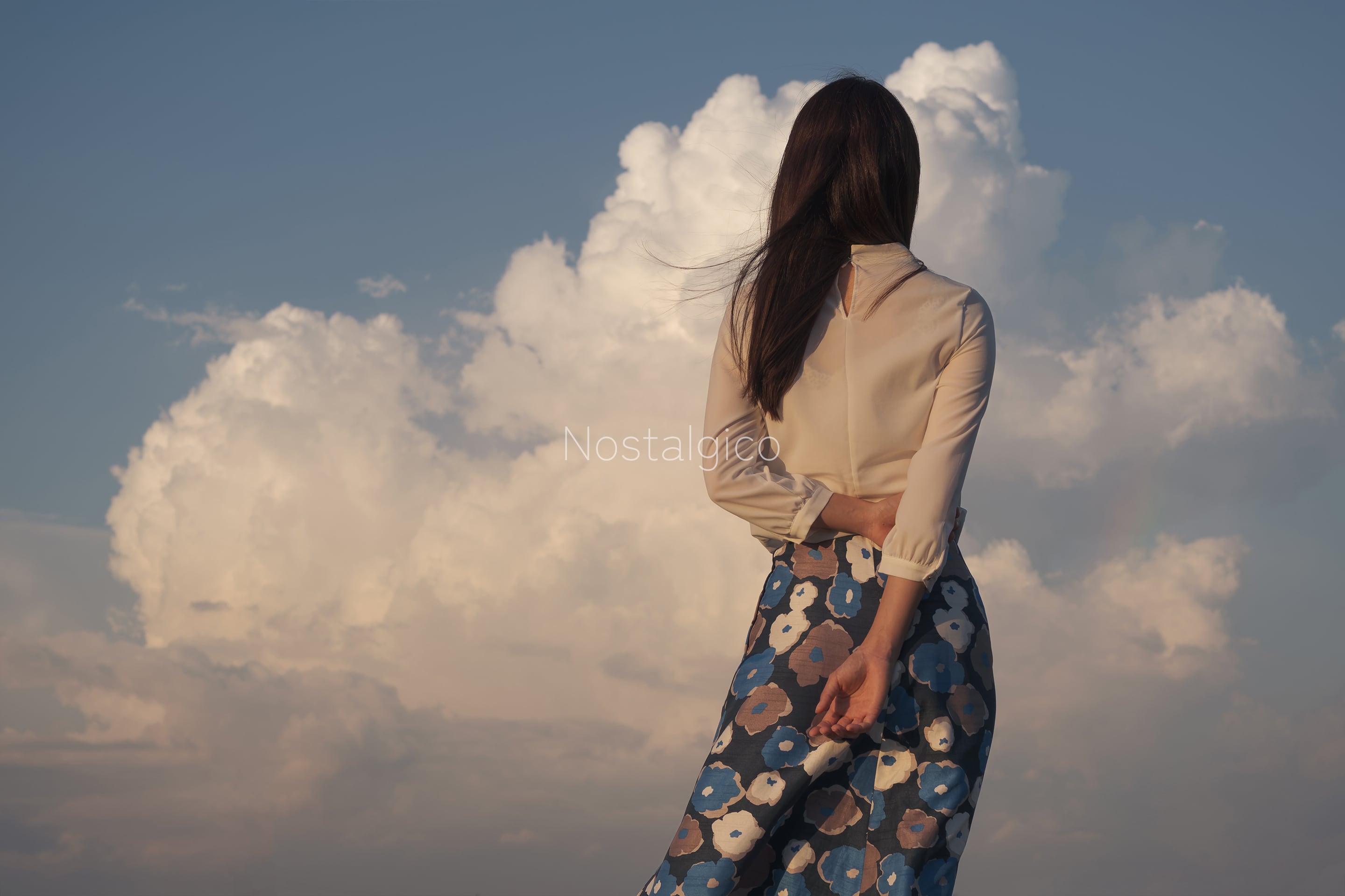 穏やかな夕暮れ時の雄大な雲と女性の優雅な姿が調和し、ロマンチックな雰囲気を醸し出しています。