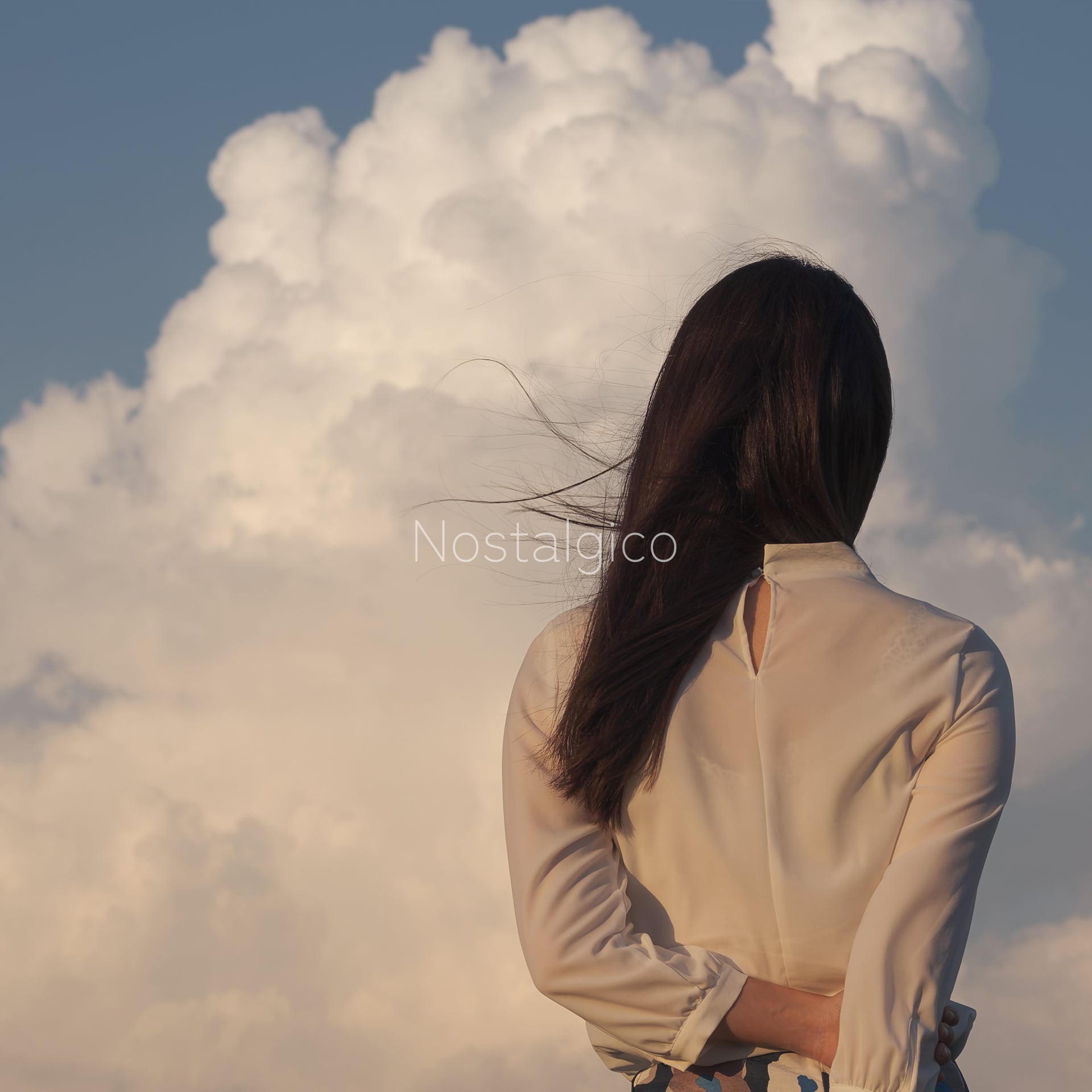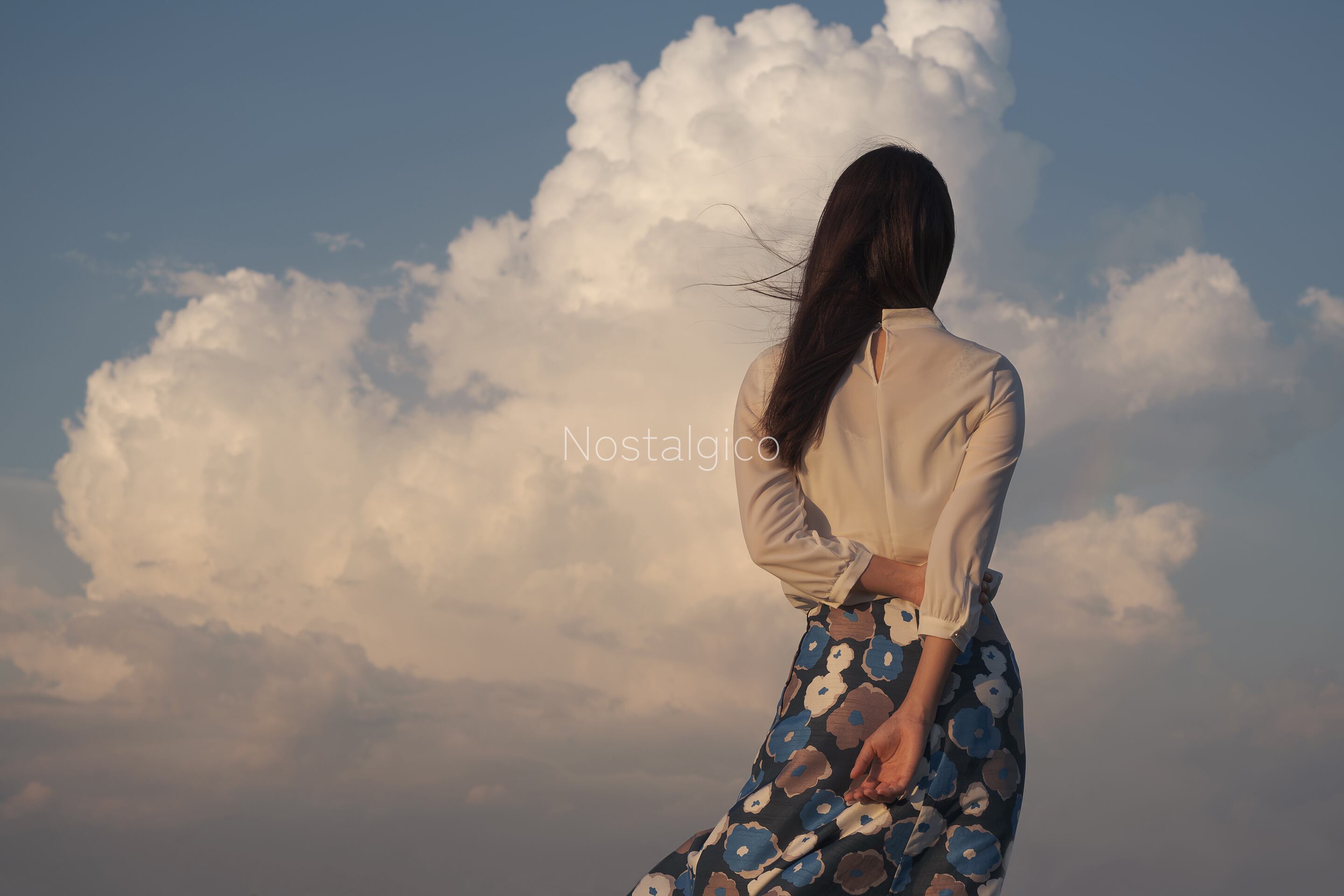 穏やかな夕暮れ時の雄大な雲と女性の優雅な姿が調和し、ロマンチックな雰囲気を醸し出しています。