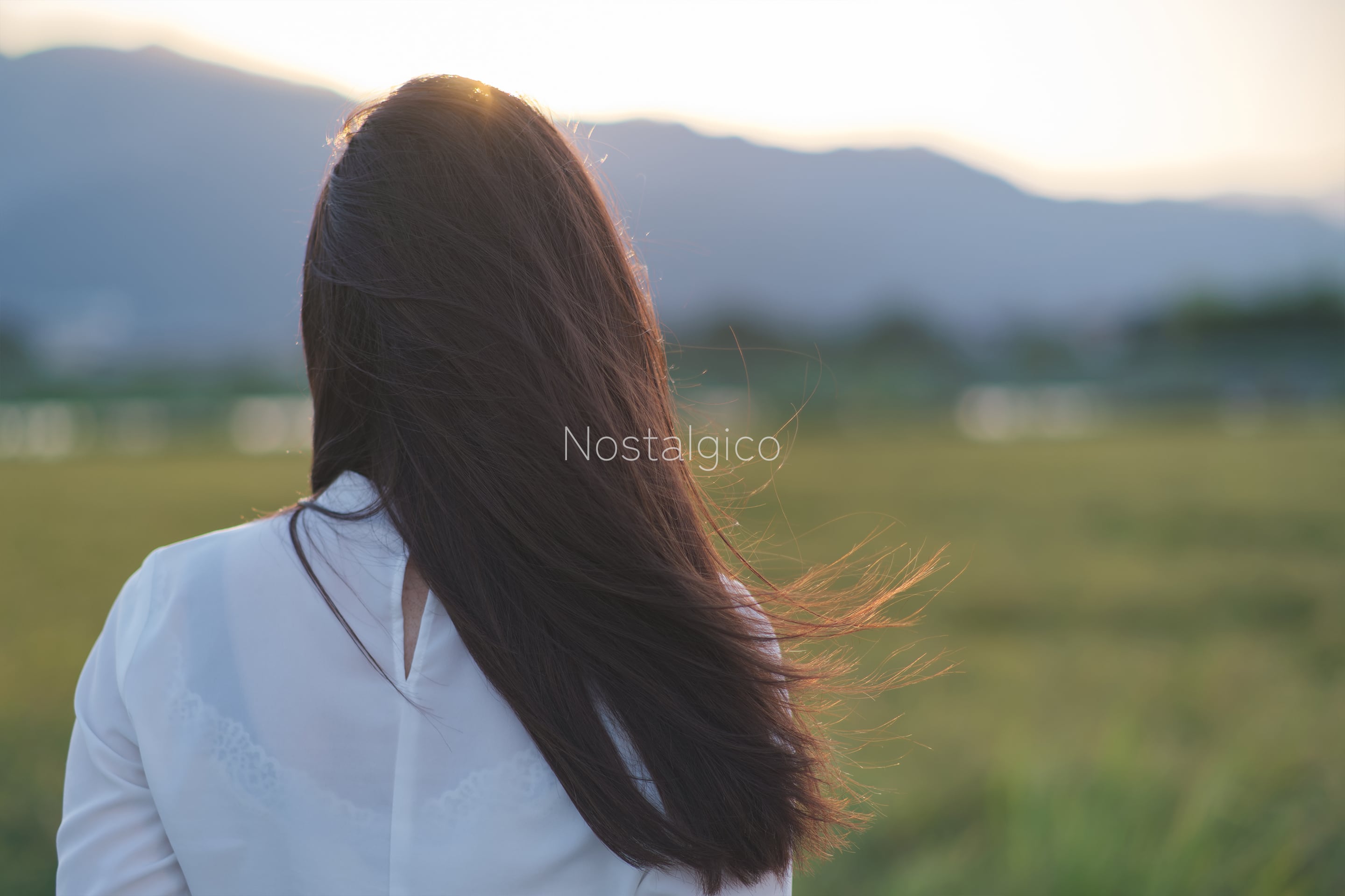 夕日に輝くロングヘアの写真です。陽光に輝く鮮やかな赤毛が女性の魅力を一層際立たせています。穏やかなそよ風に優雅に髪をなびかせ、夕日に照らされる姿は絵画のような美しさがあります。