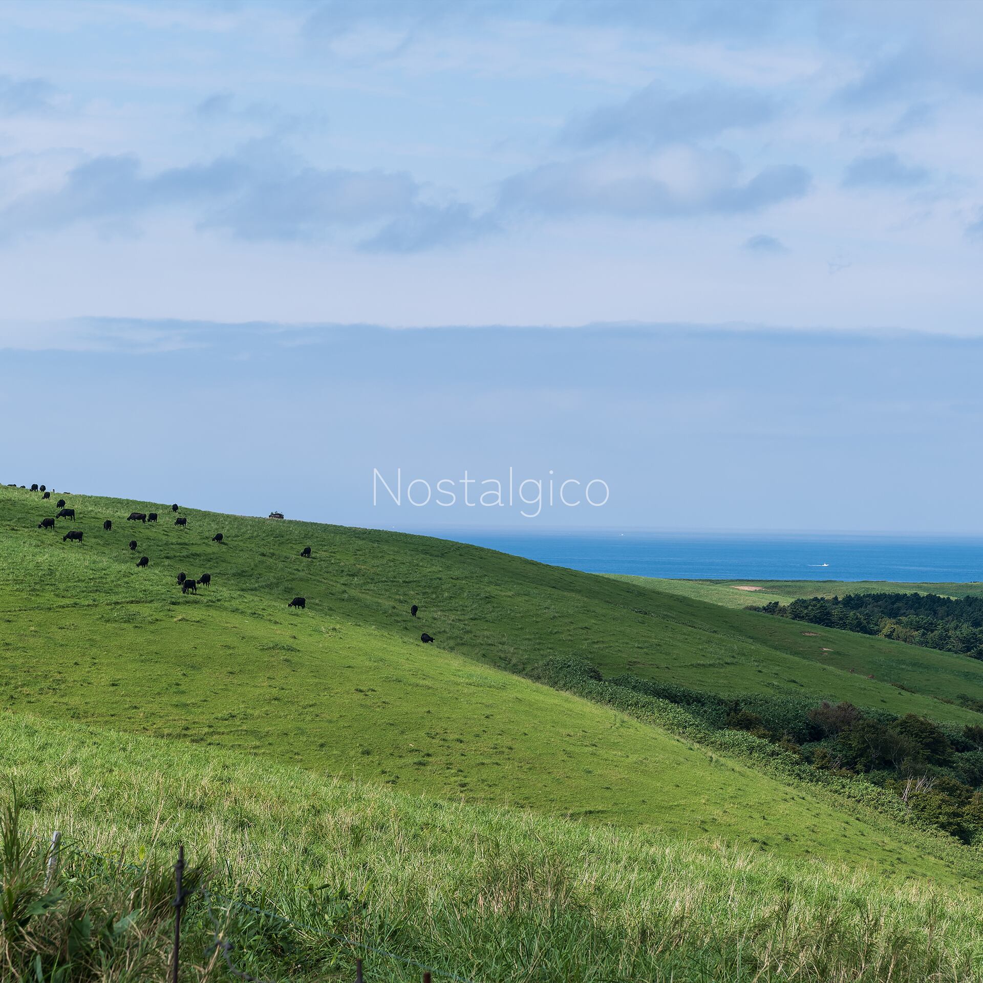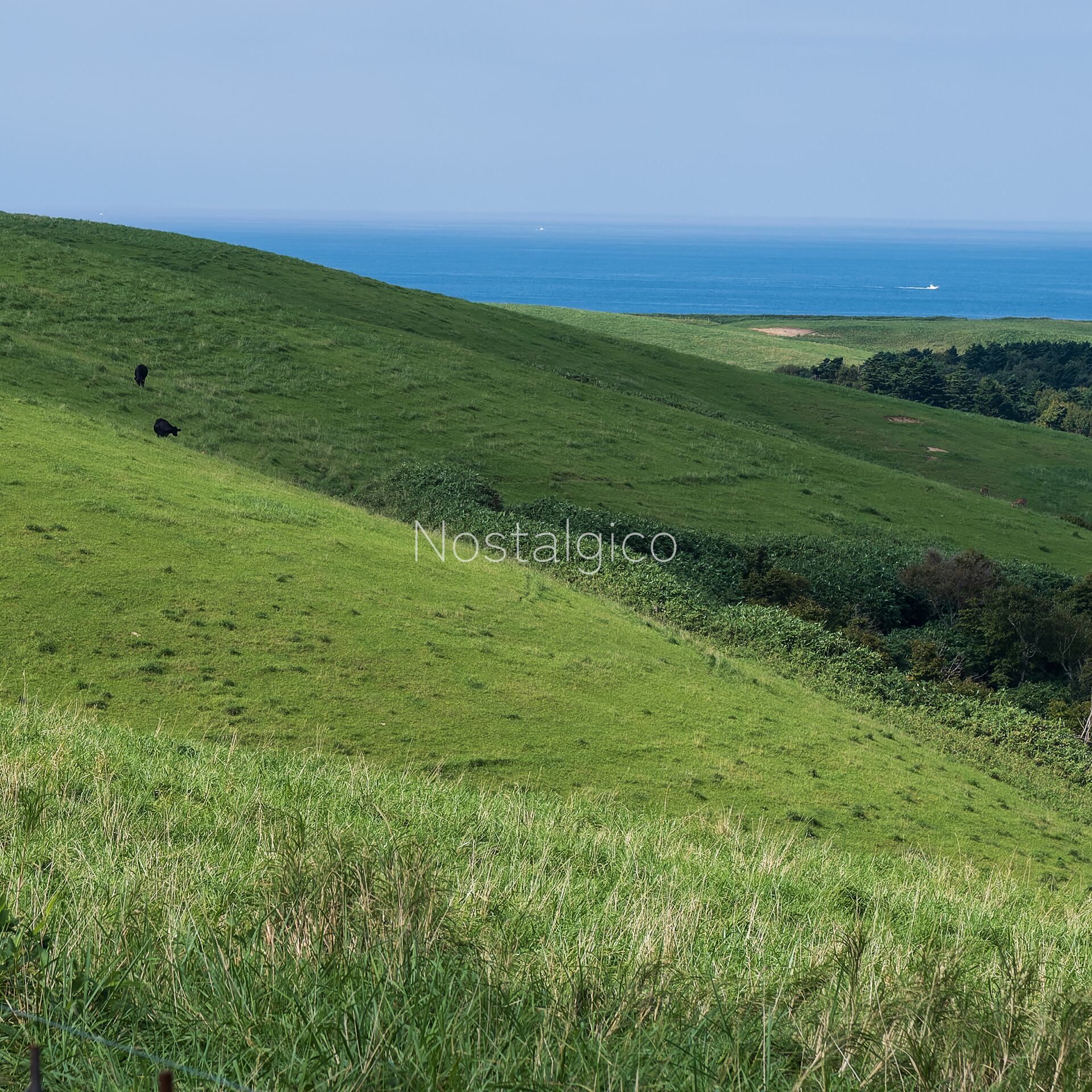 左側に見える幾つかの黒い点は放牧されている黒毛和牛です。