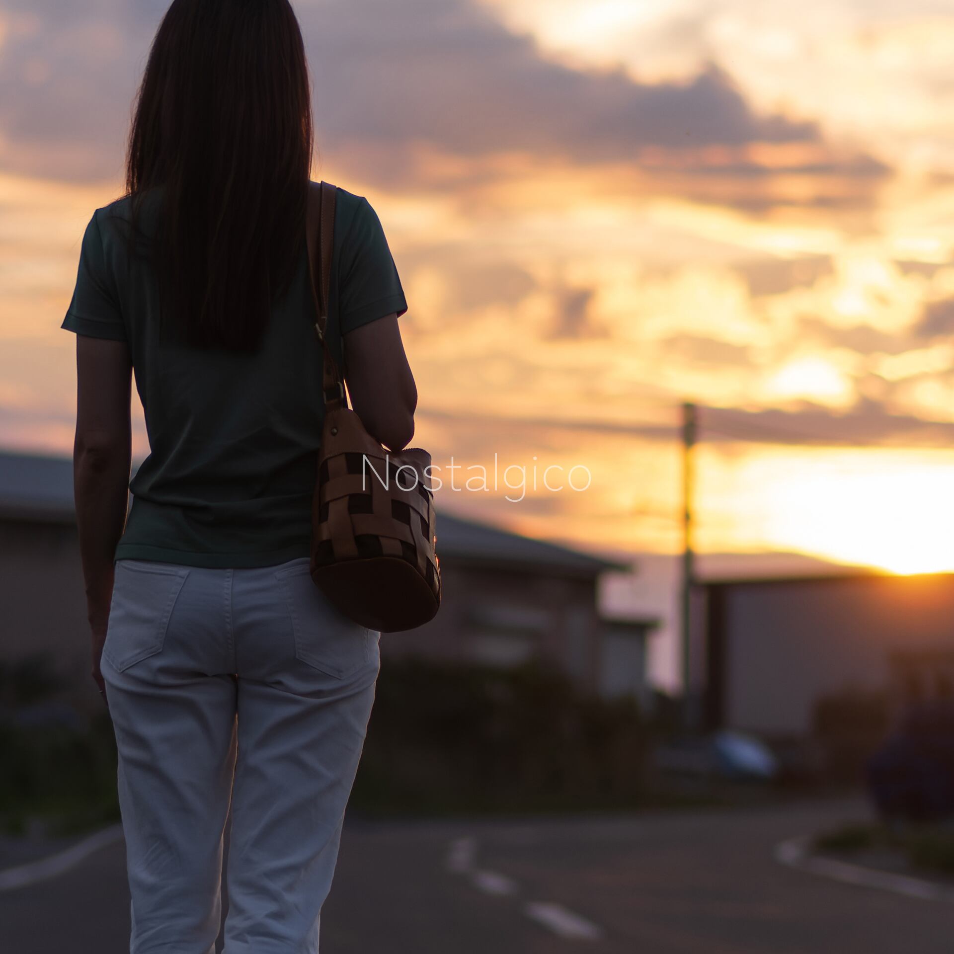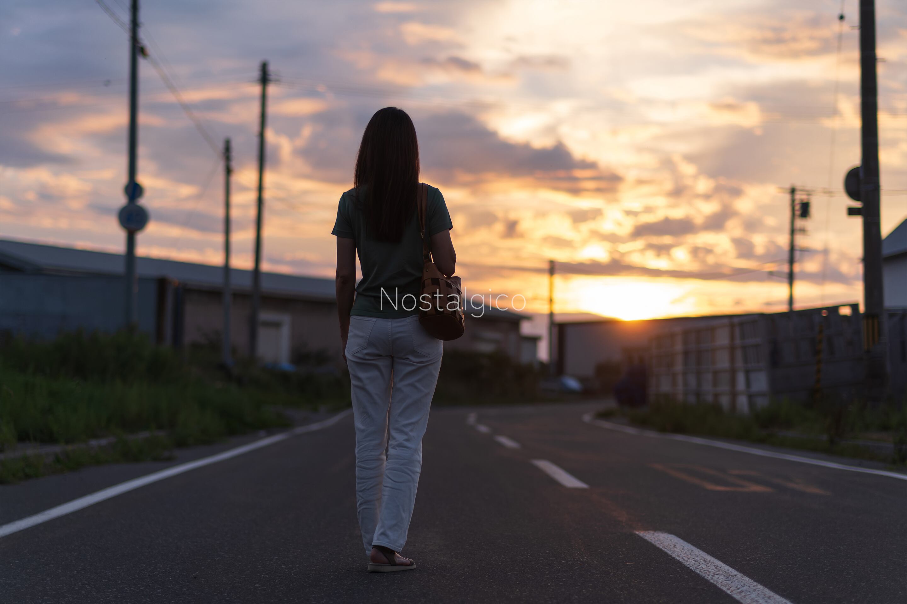 夕日のオレンジ色が彩る空と、女性のシルエットが調和した美しい一枚です。