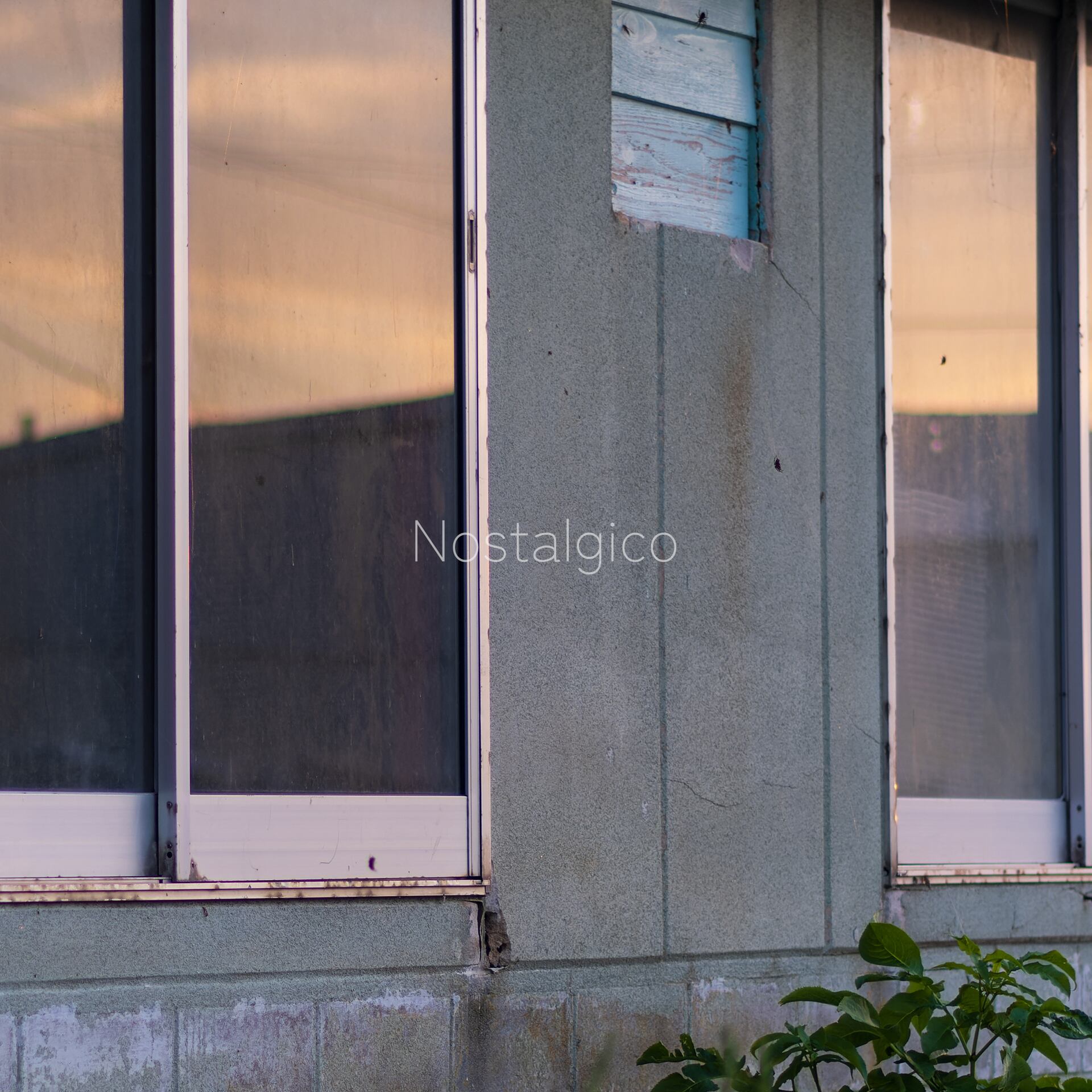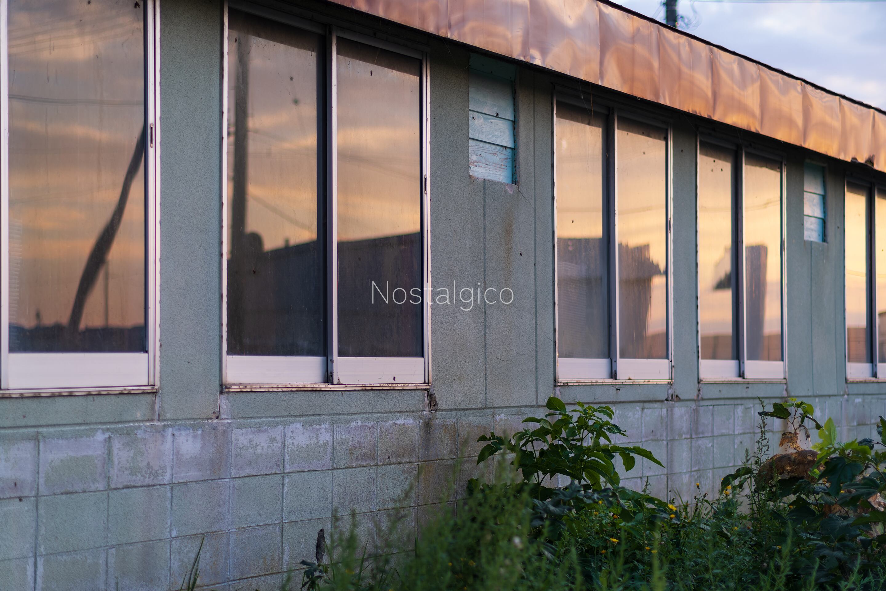 廃墟の窓ガラスに夕焼けが写りこんだ写真素材です。