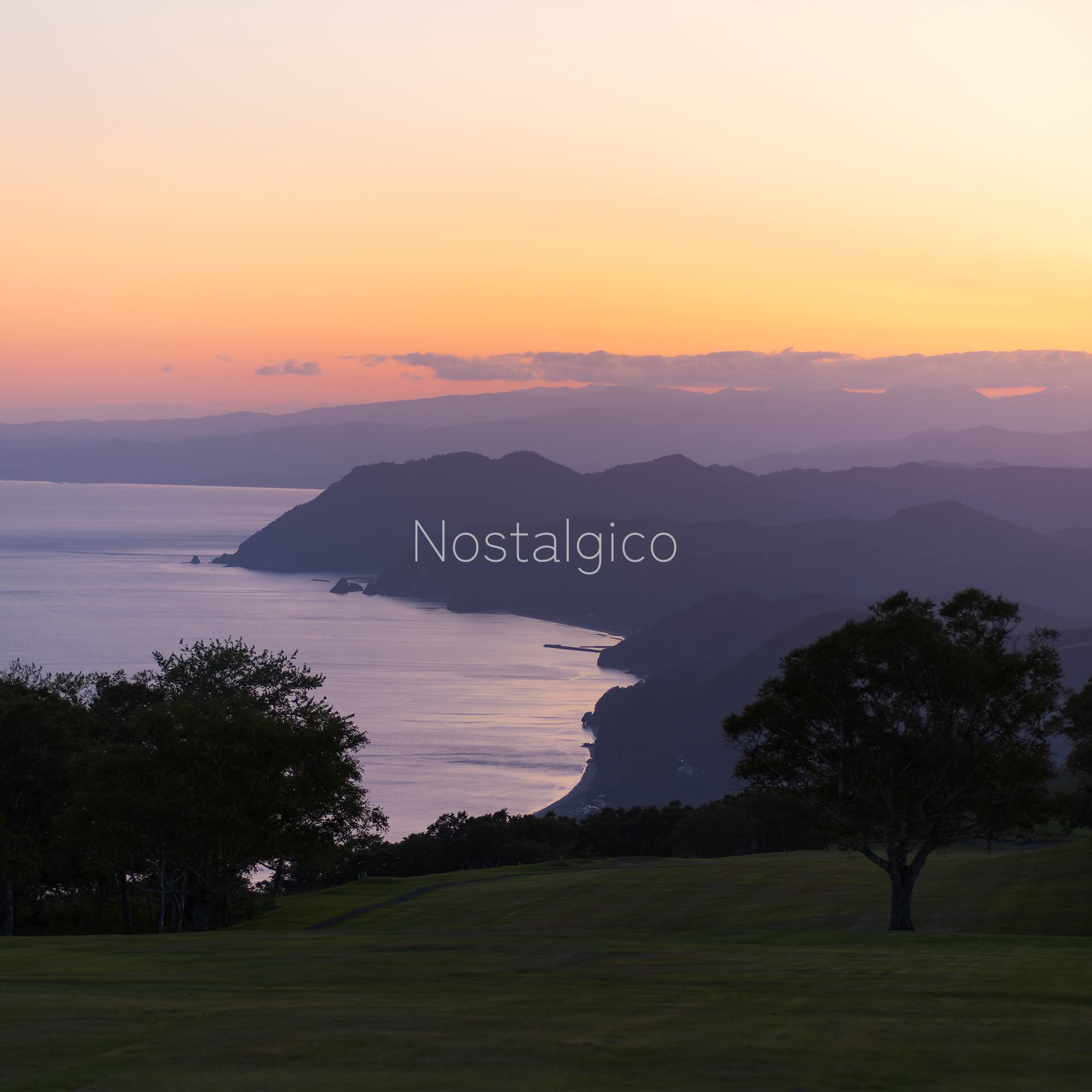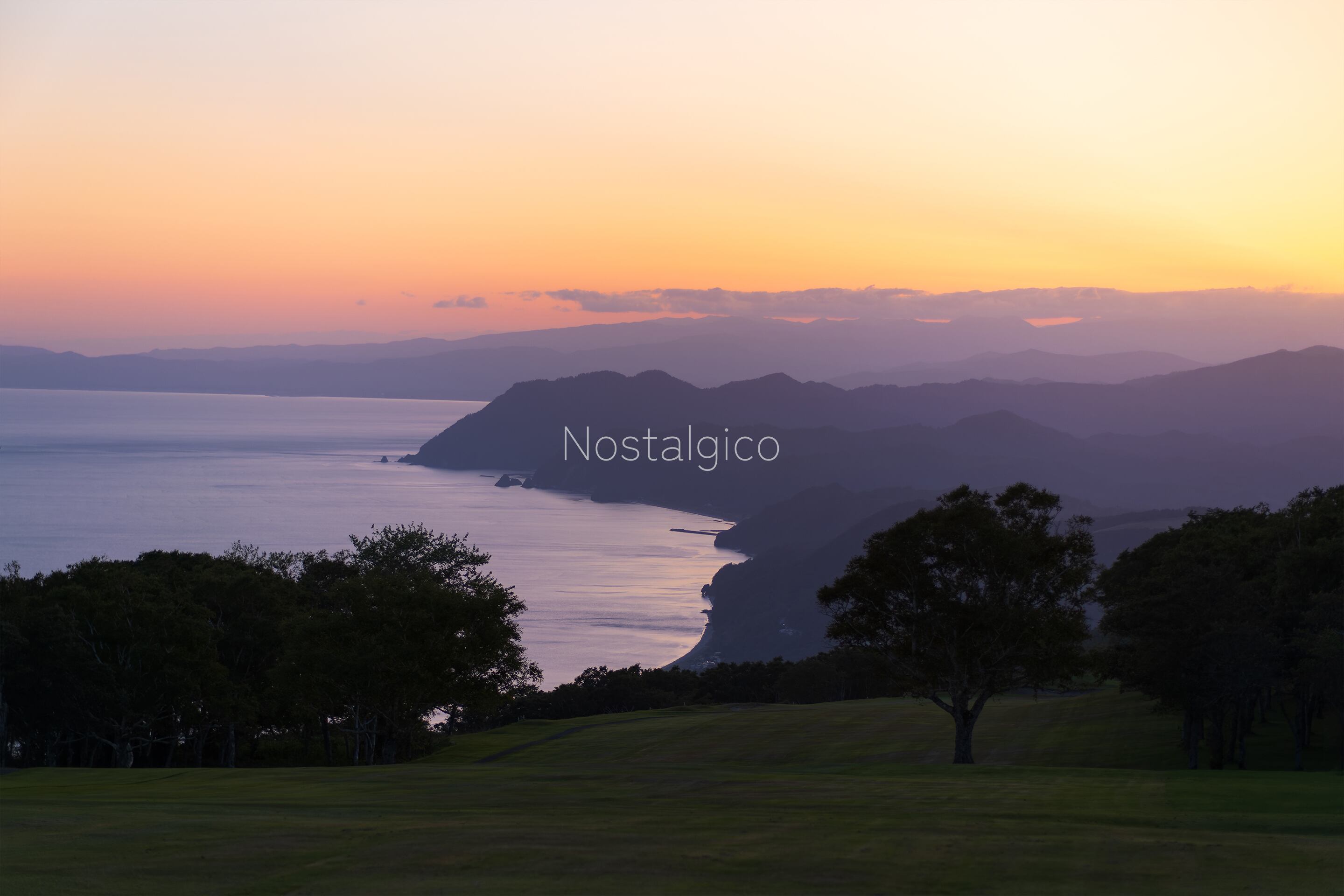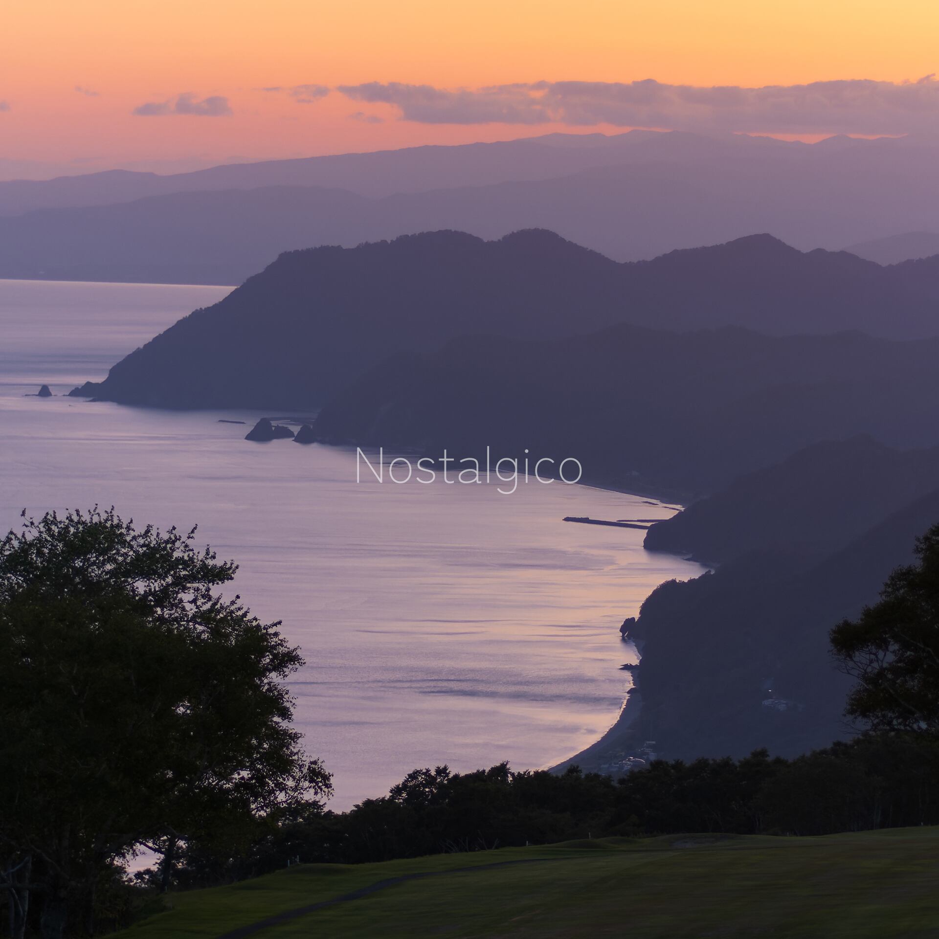 空のグラデーションに海が染まった湾と岬や木々のコントラストが美しい風景です。
