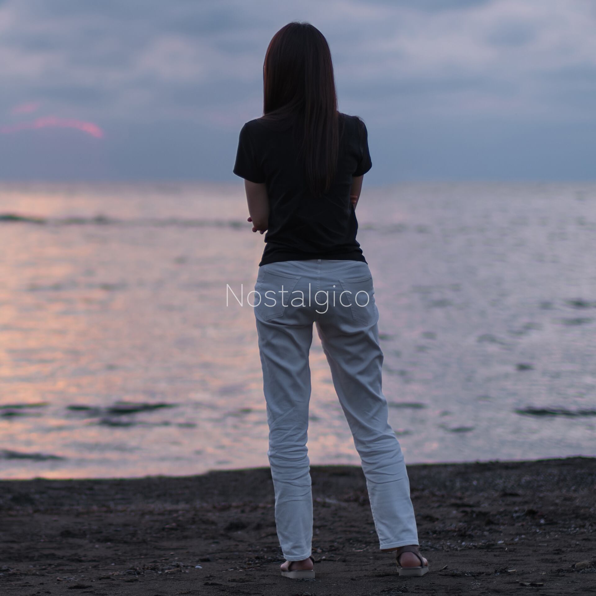日が沈んだ後の海を眺めるロングヘアの女性の写真素材です。