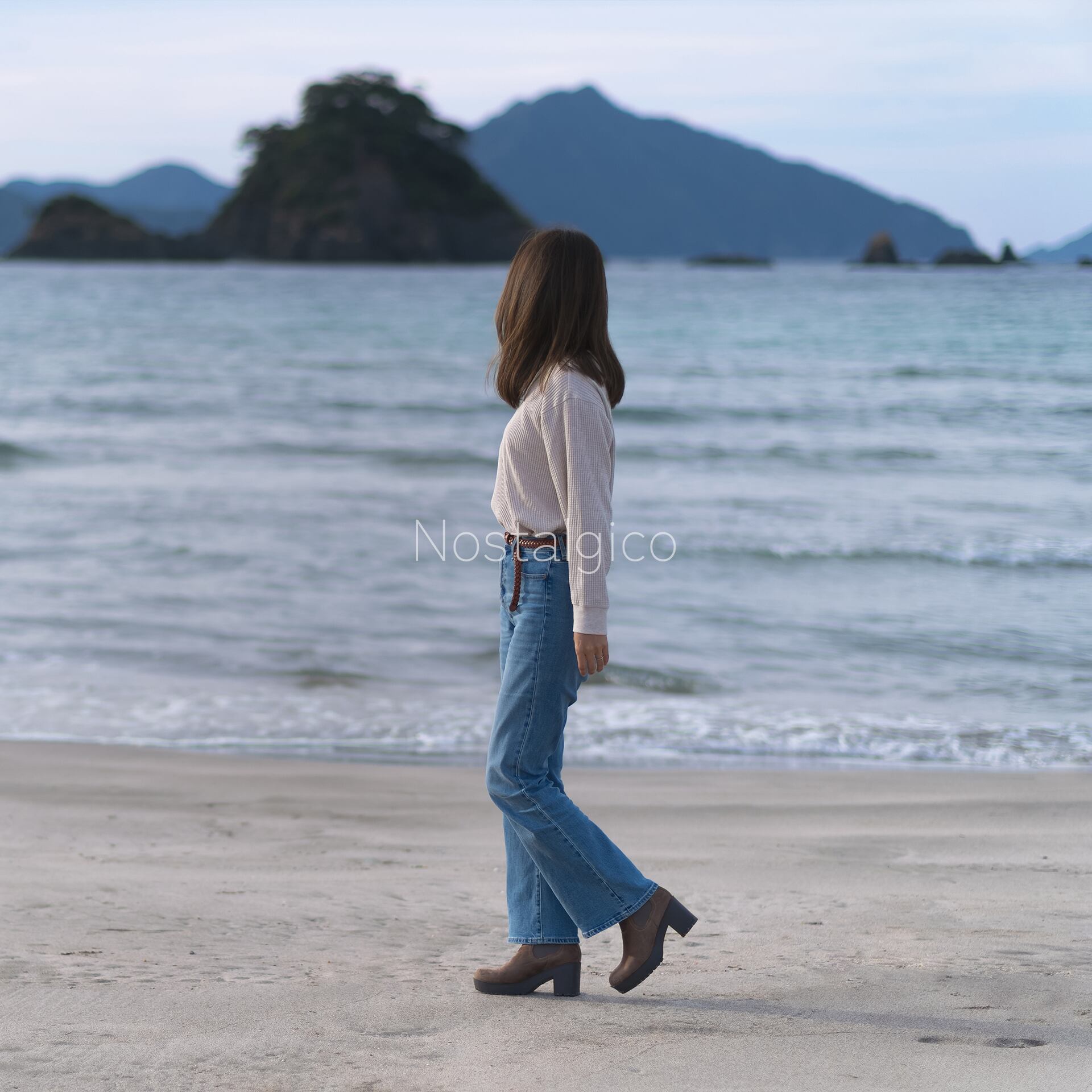 フレアジーンズをはいたロングヘアの女性が秋の海辺を歩いている写真素材です。フレアジーンズのおしゃれで軽やかな雰囲気が伝わる一枚です。フレアジーンズをシンプルに着こなしているため、様々なシーンで写真素材として活用できます。