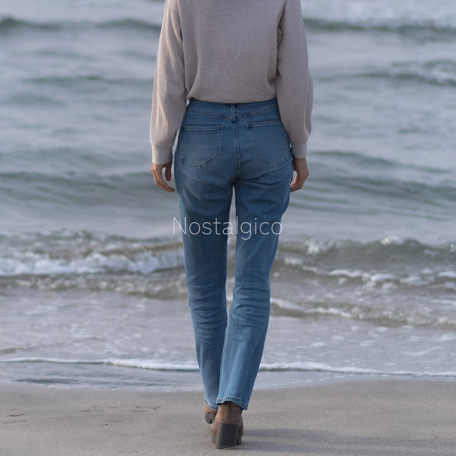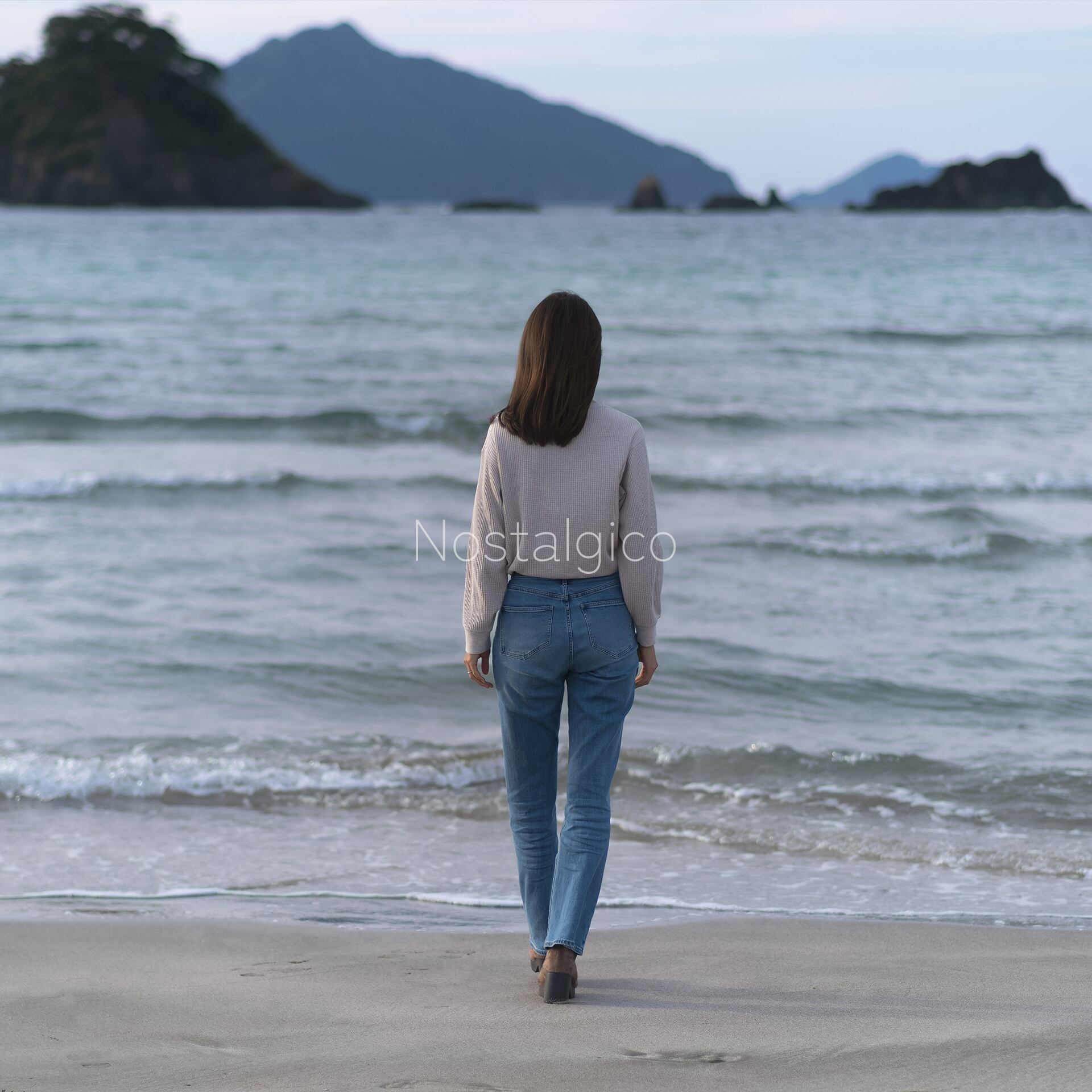 フレアジーンズをはいたロングヘアの女性が秋の海辺を歩いている写真素材です。フレアジーンズのおしゃれで軽やかな雰囲気が伝わる一枚です。フレアジーンズをシンプルに着こなしているため、様々なシーンで写真素材として活用できます。