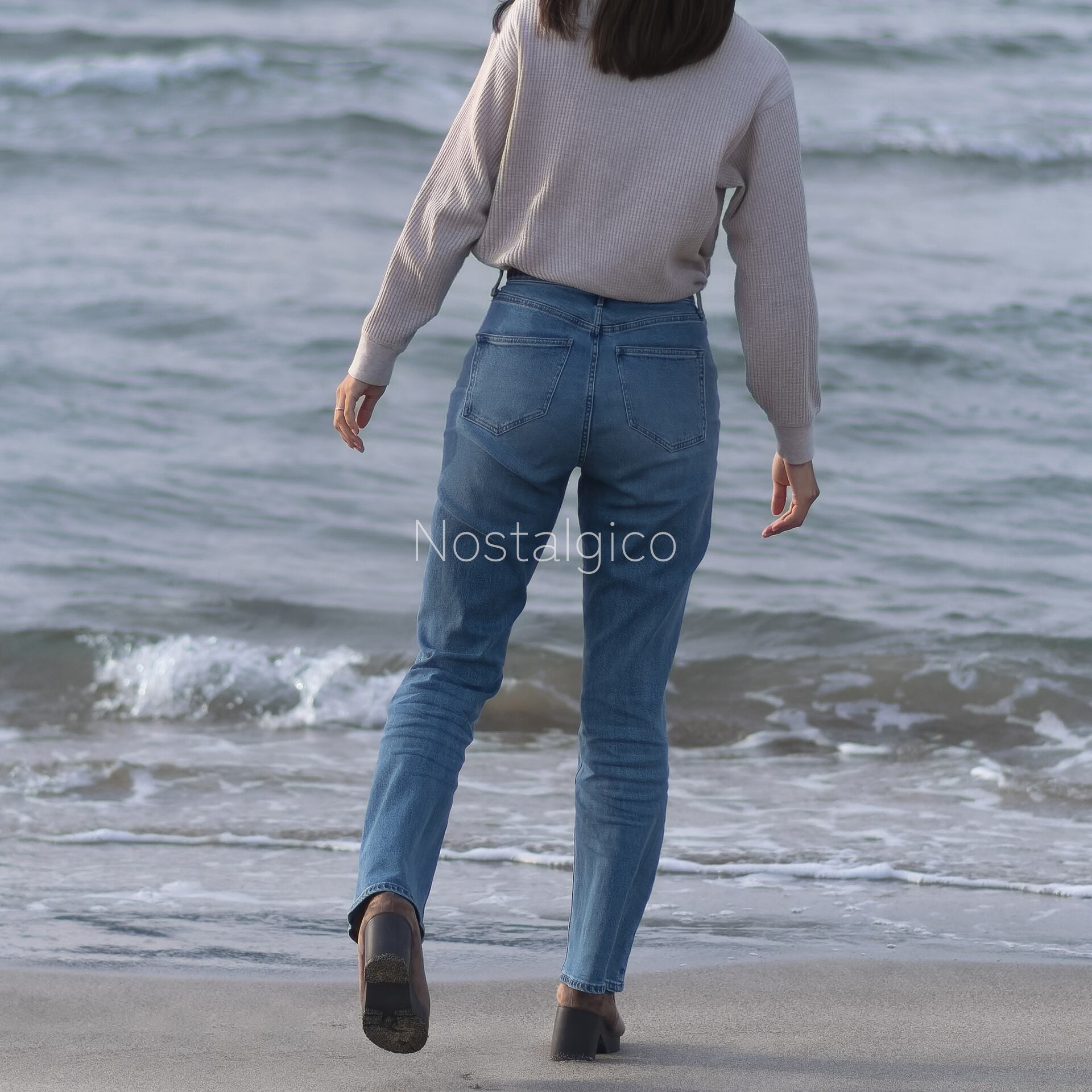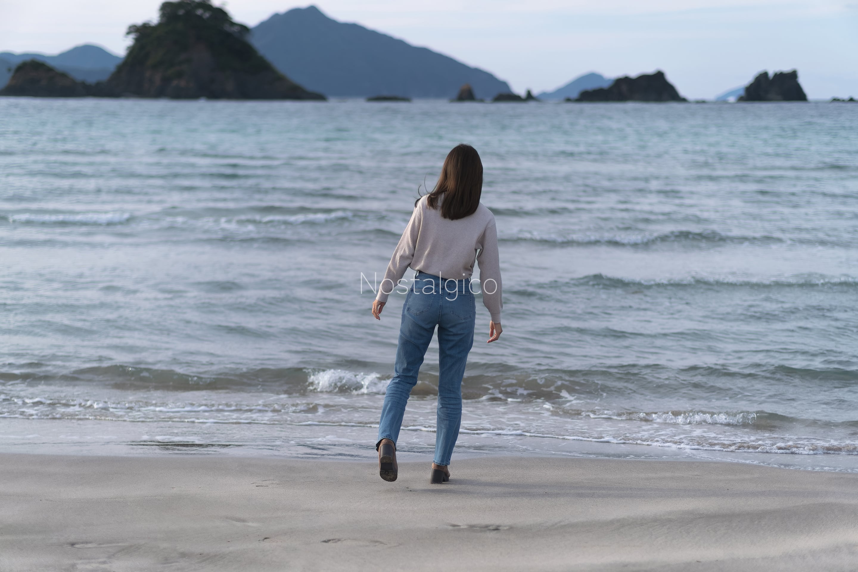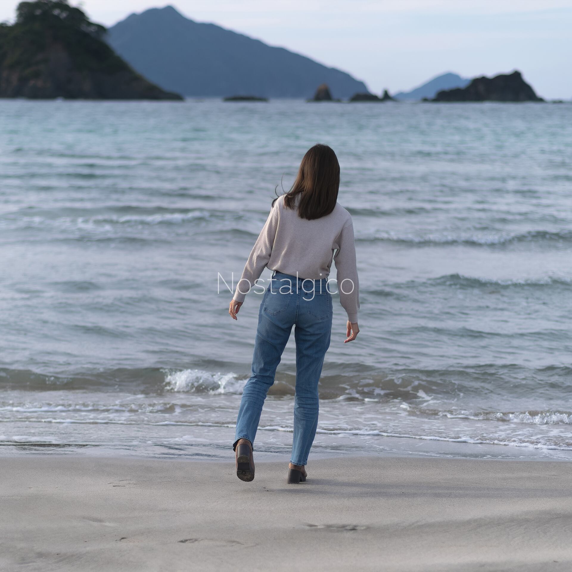 フレアジーンズをはいたロングヘアの女性が秋の海辺を歩いている写真素材です。ヒールが高い靴で少しぎこちない歩き方を切り取りました。フレアジーンズのおしゃれで軽やかな雰囲気が伝わる一枚です。フレアジーンズをシンプルに着こなしているため、様々なシーンで写真素材として活用できます。