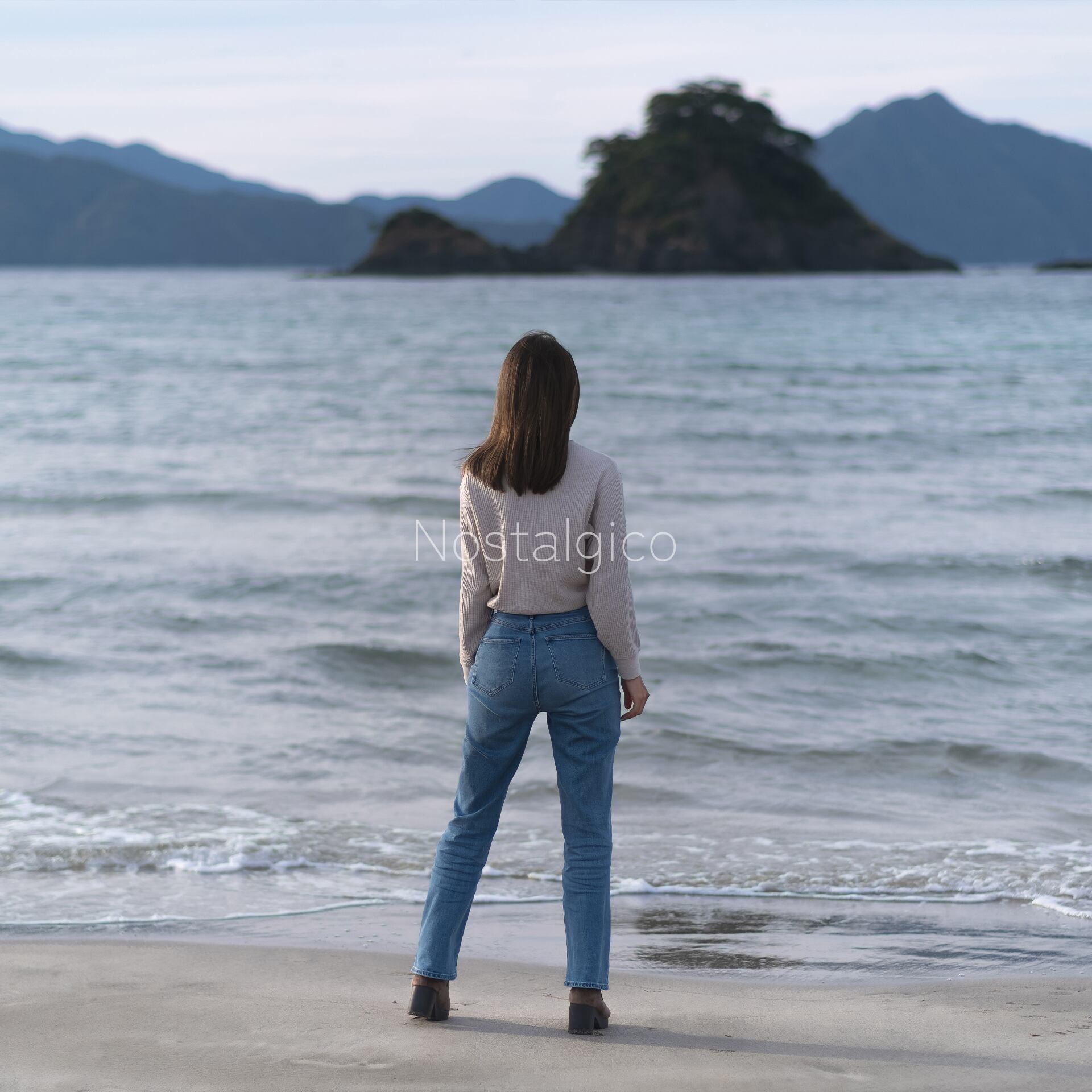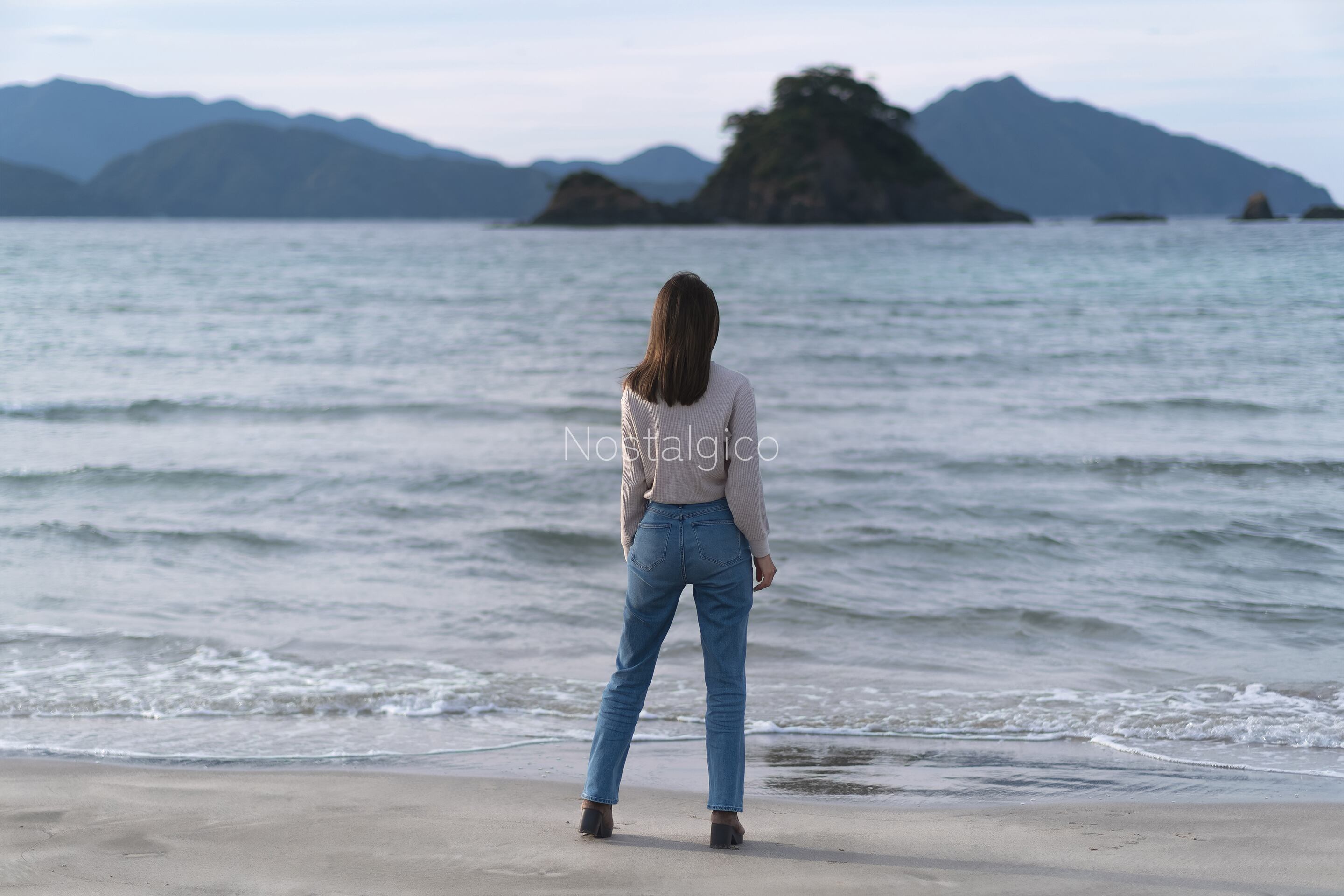 秋の海の砂浜を眺めるフレアジーンズをはいた女性(福井県 若狭和田ビーチ)