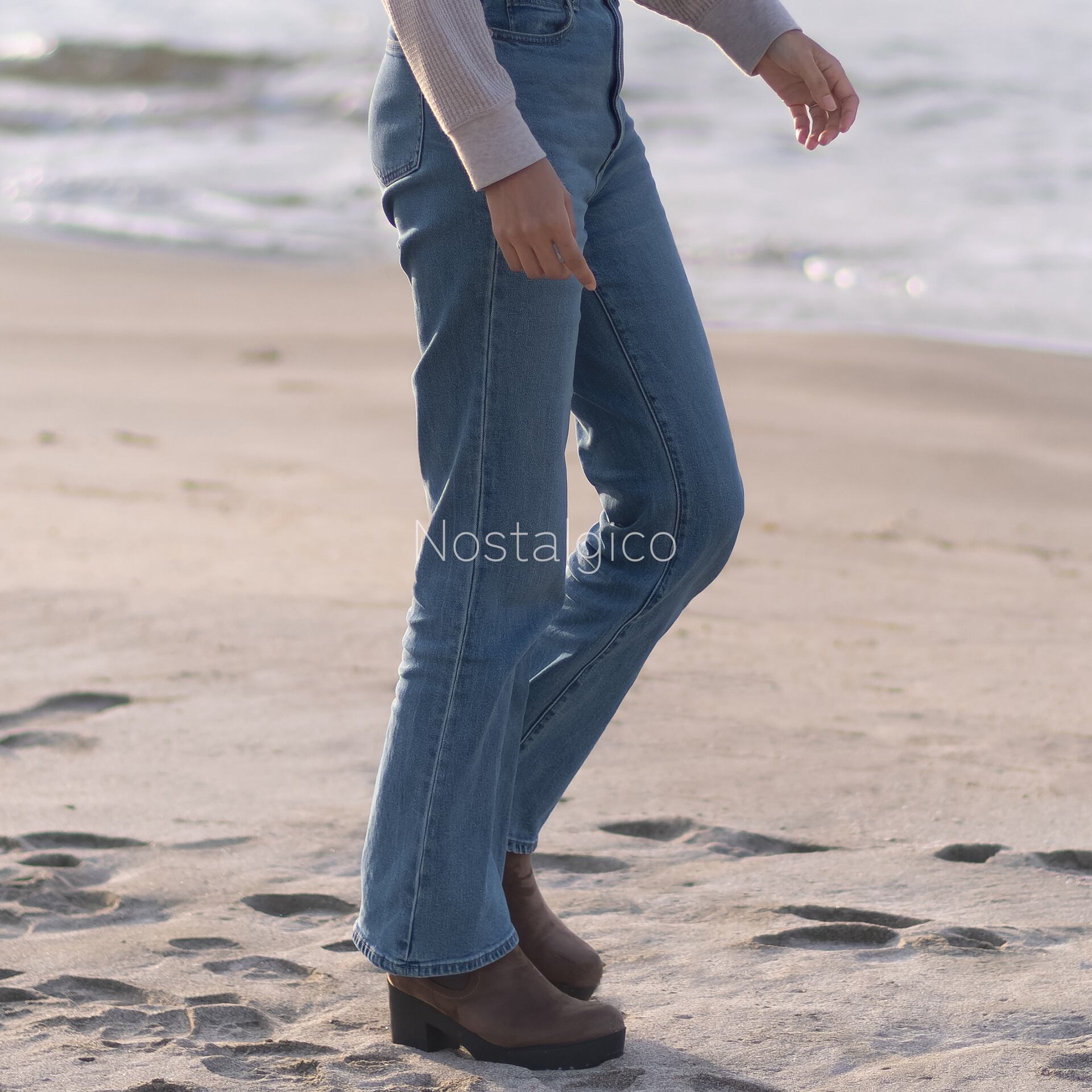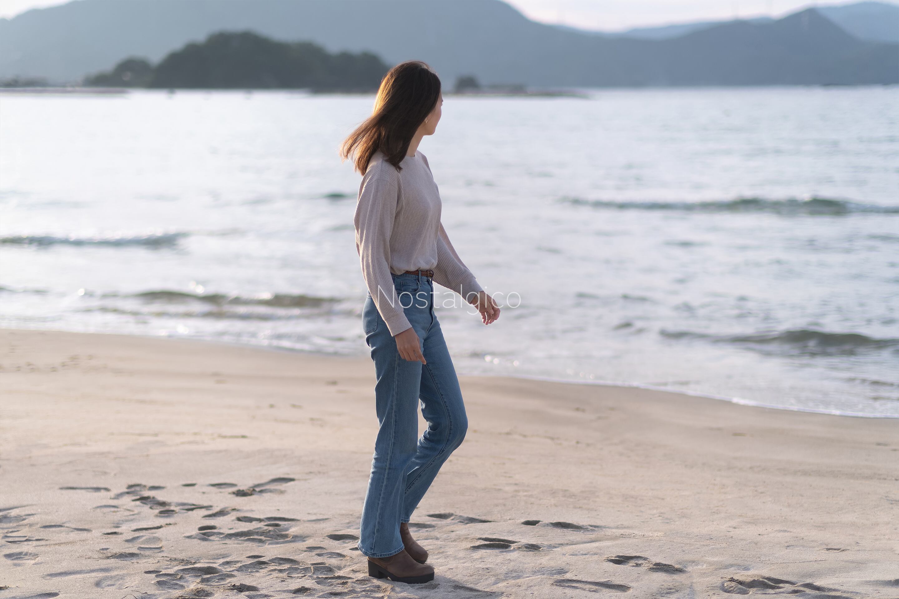 フレアジーンズをはいたロングヘアの女性が秋の海辺を歩いている写真素材です。フレアジーンズのおしゃれで軽やかな雰囲気が伝わる一枚です。フレアジーンズをシンプルに着こなしているため、様々なシーンで写真素材として活用できます。