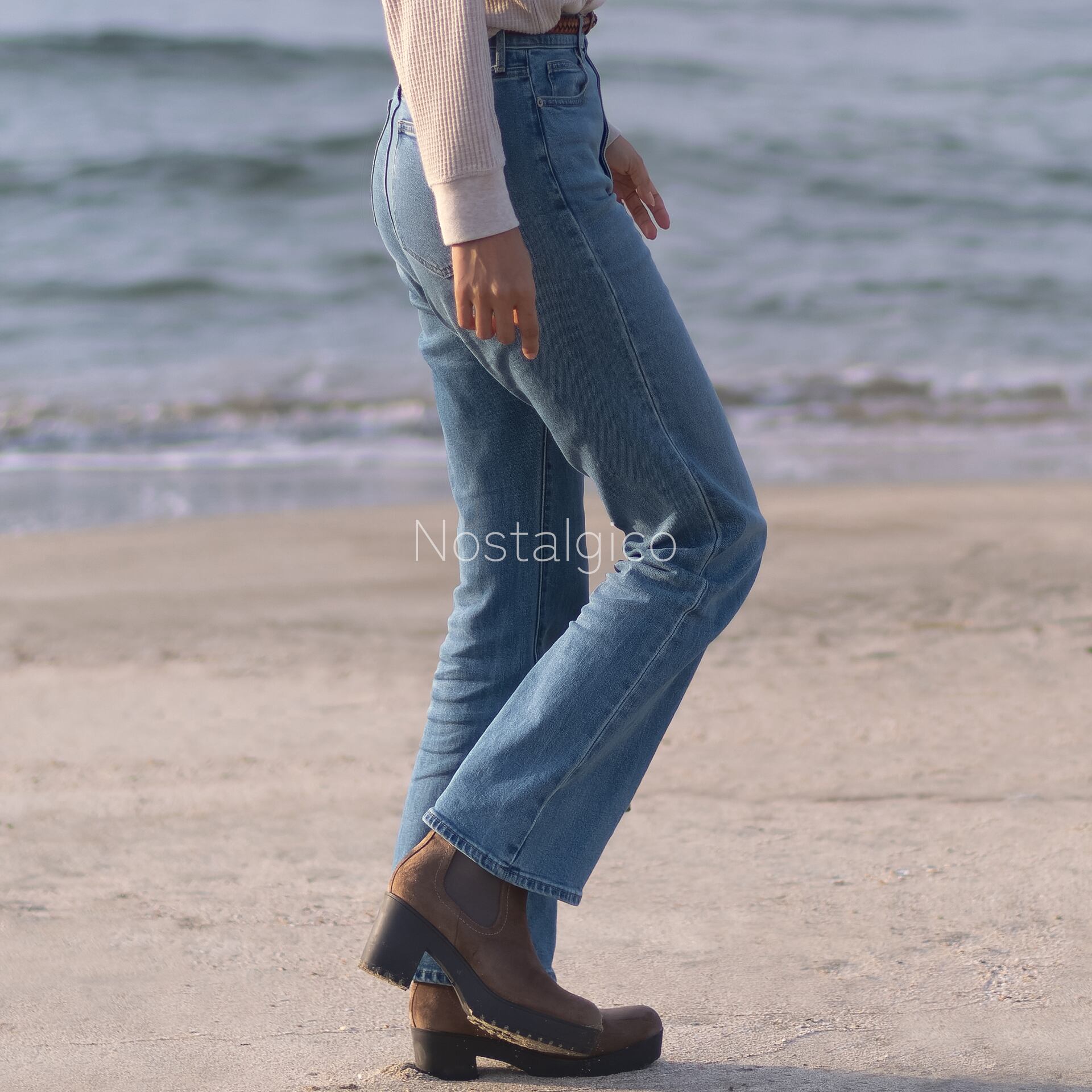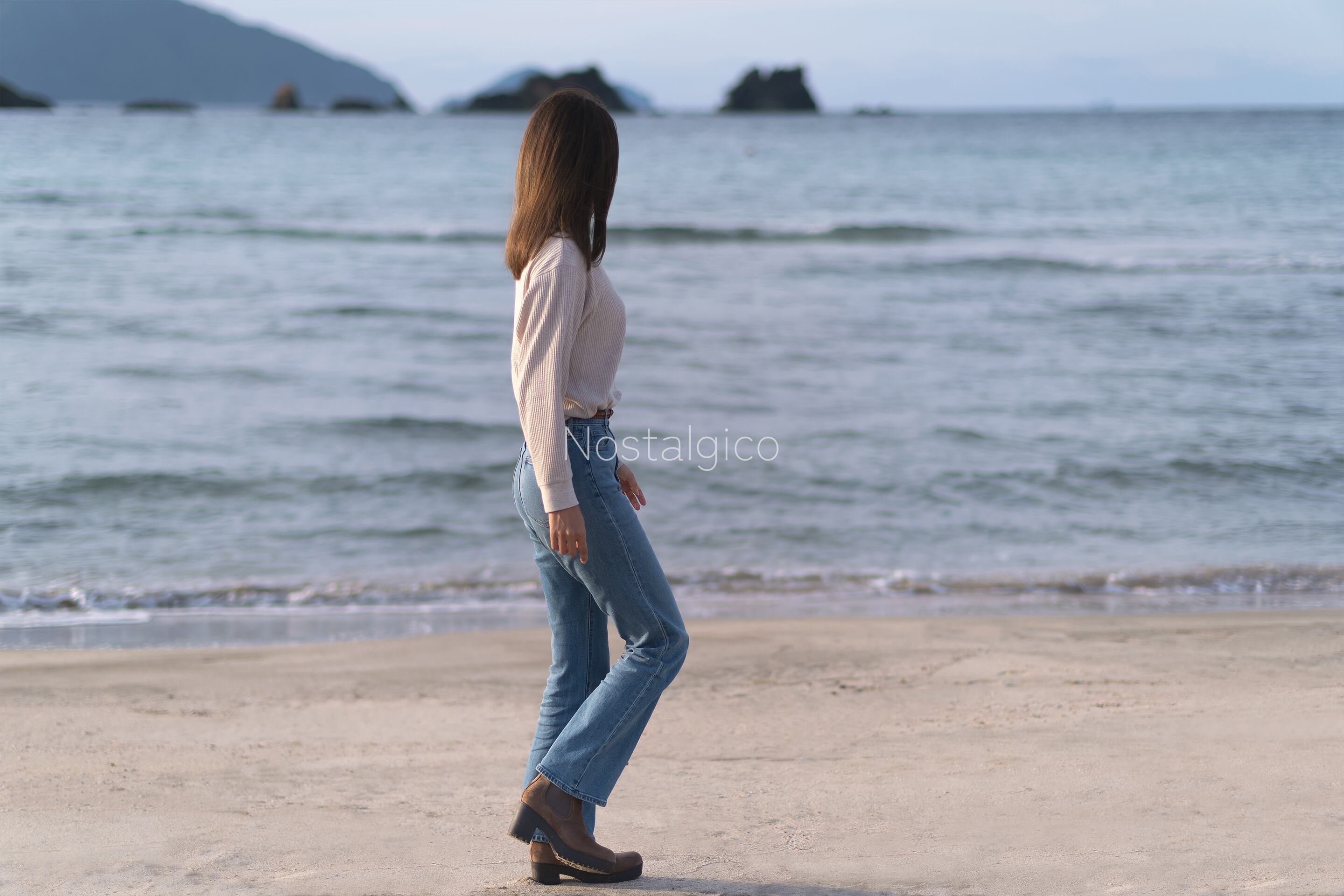 フレアジーンズをはいたロングヘアの女性が秋の海辺を歩いている写真素材です。フレアジーンズのおしゃれで軽やかな雰囲気が伝わる一枚です。フレアジーンズをシンプルに着こなしているため、様々なシーンで写真素材として活用できます。