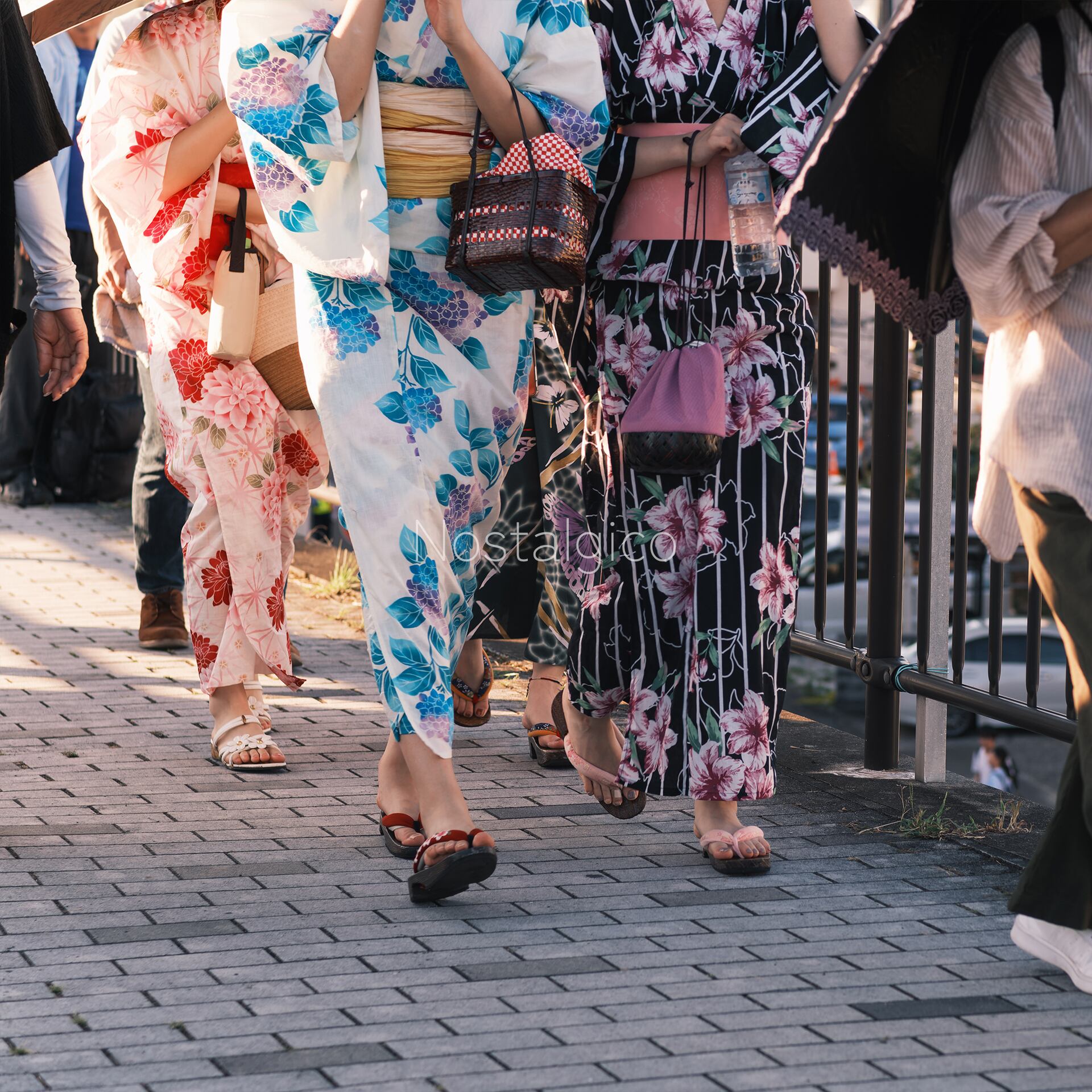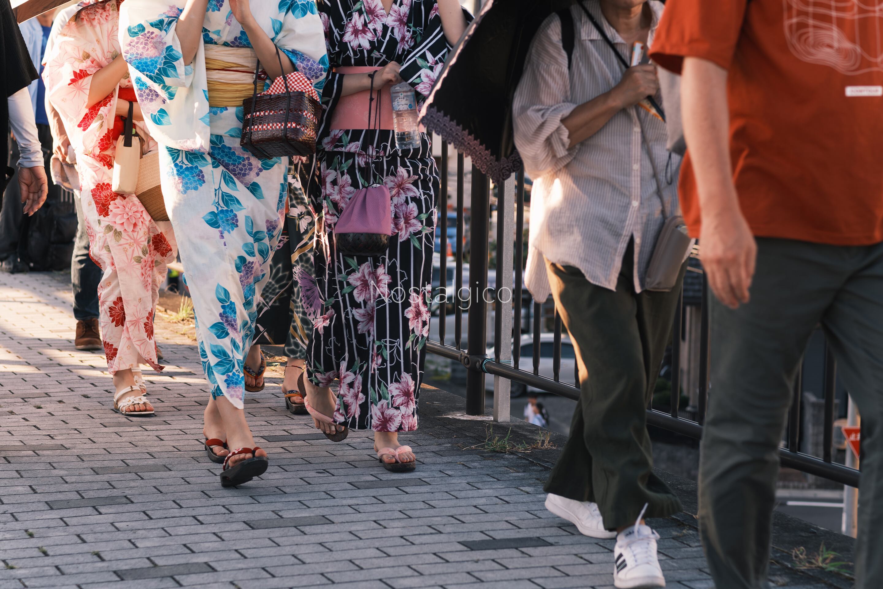 花火大会へ向かう人々の楽しげな姿をとらえた写真素材です。