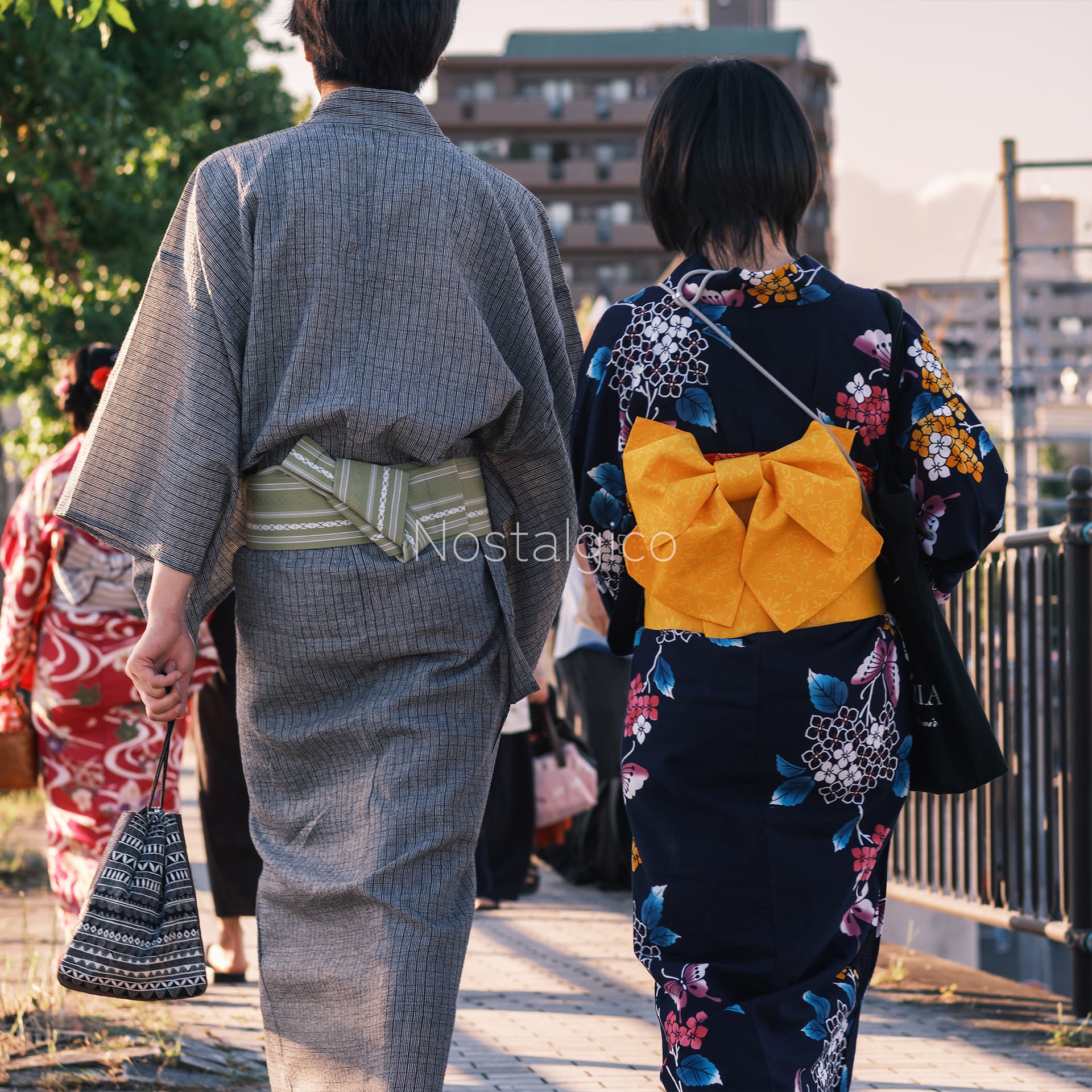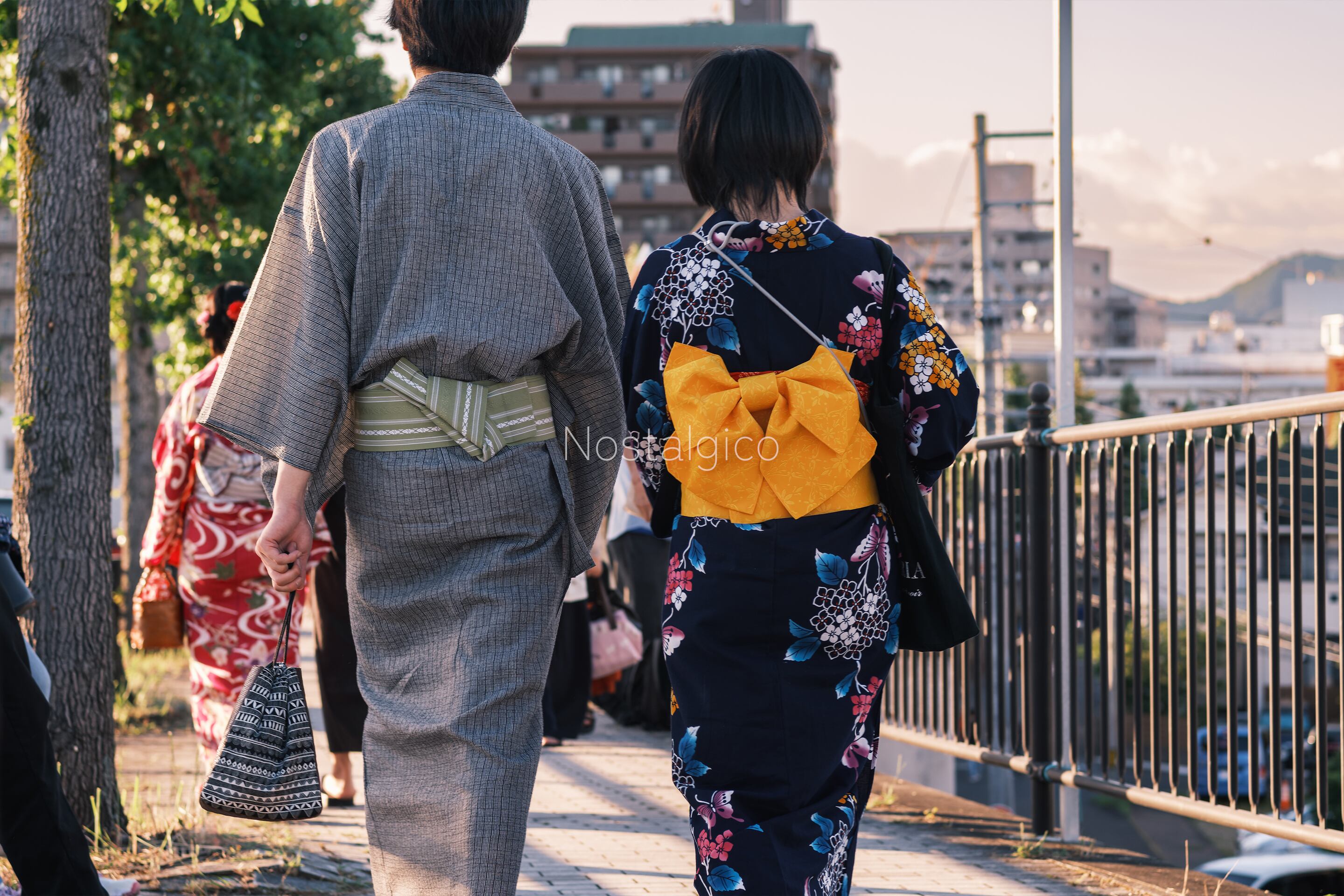 夏の夕暮れの美しい光と、華やかな着物の色あいが絶妙に重なり合った瞬間を切り取っています。
