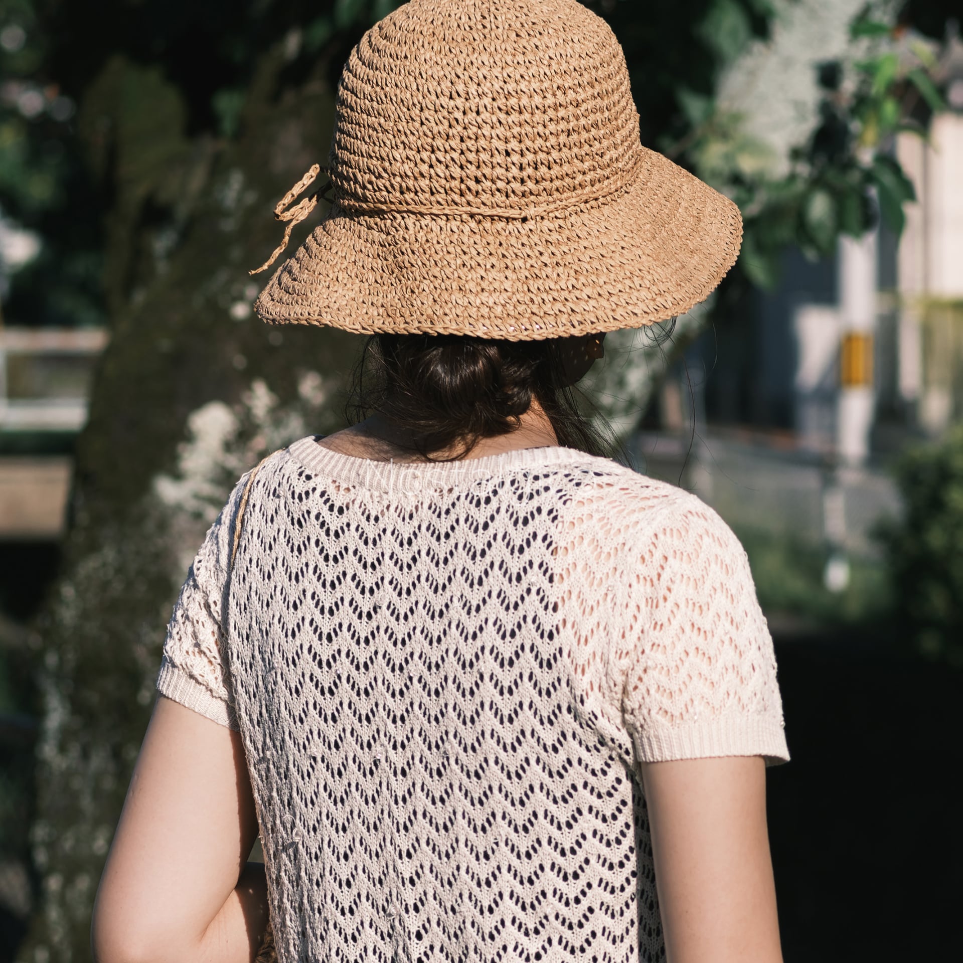 夏の陽気な気分を盛り上げる、麦わら帽子を被った女性の写真素材です。夕方の自然光の中で撮影されたため、リアルな陰影と色彩が感じられます。