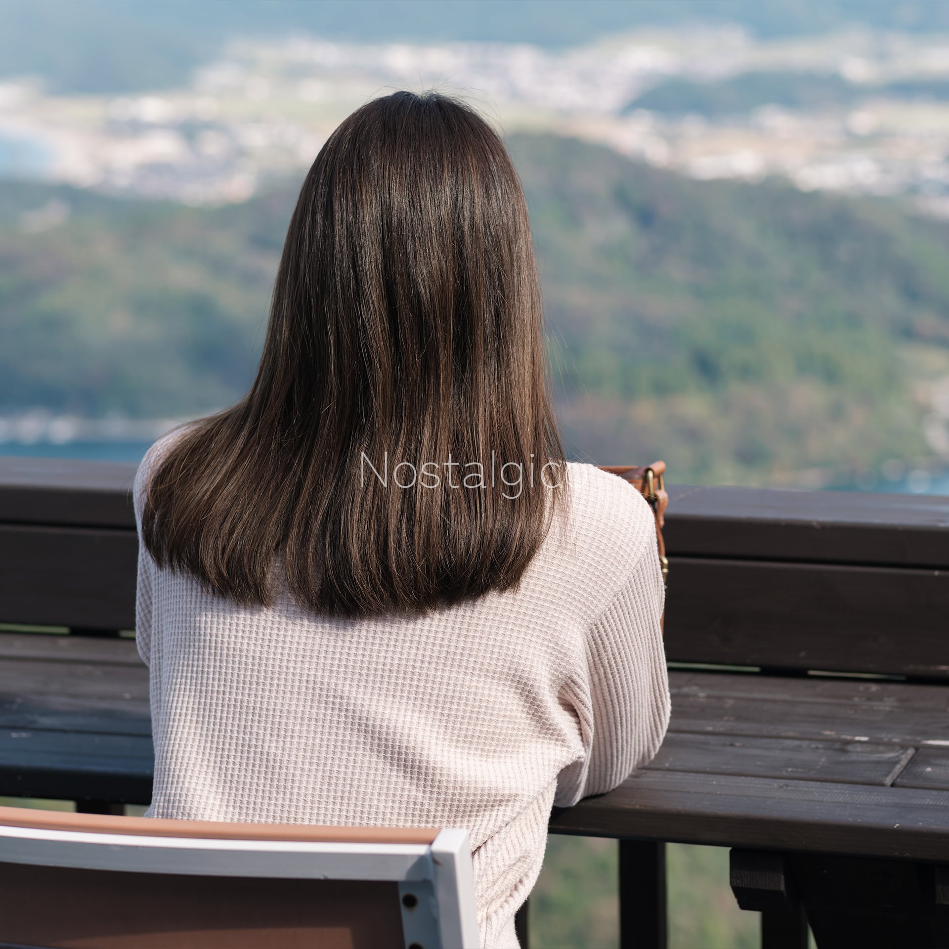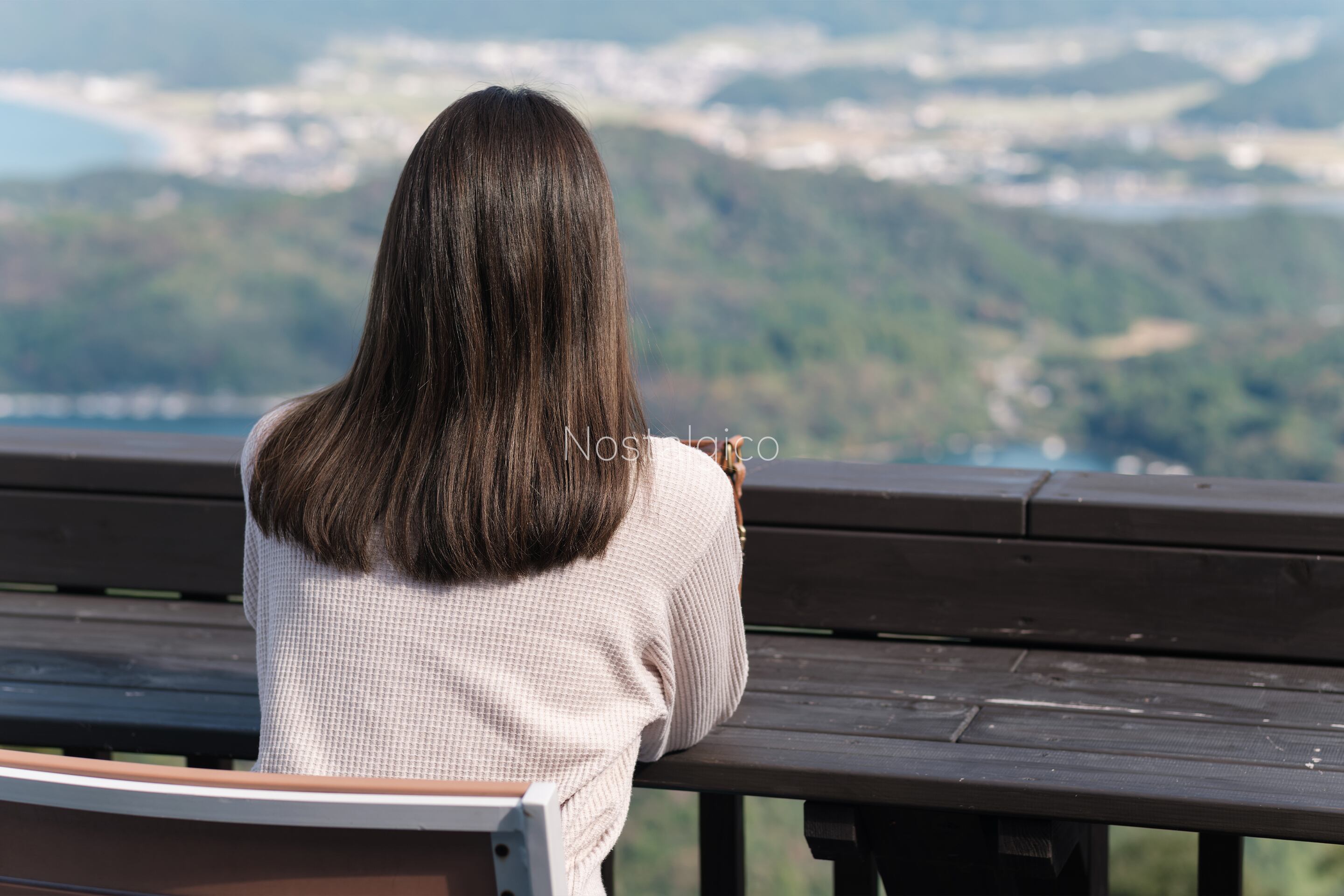風景と女性の美しいヘアカラーがマッチした写真です。自然光の下での髪の輝きや鮮やかな色合い、髪のしなやかさの参考になる写真素材です。