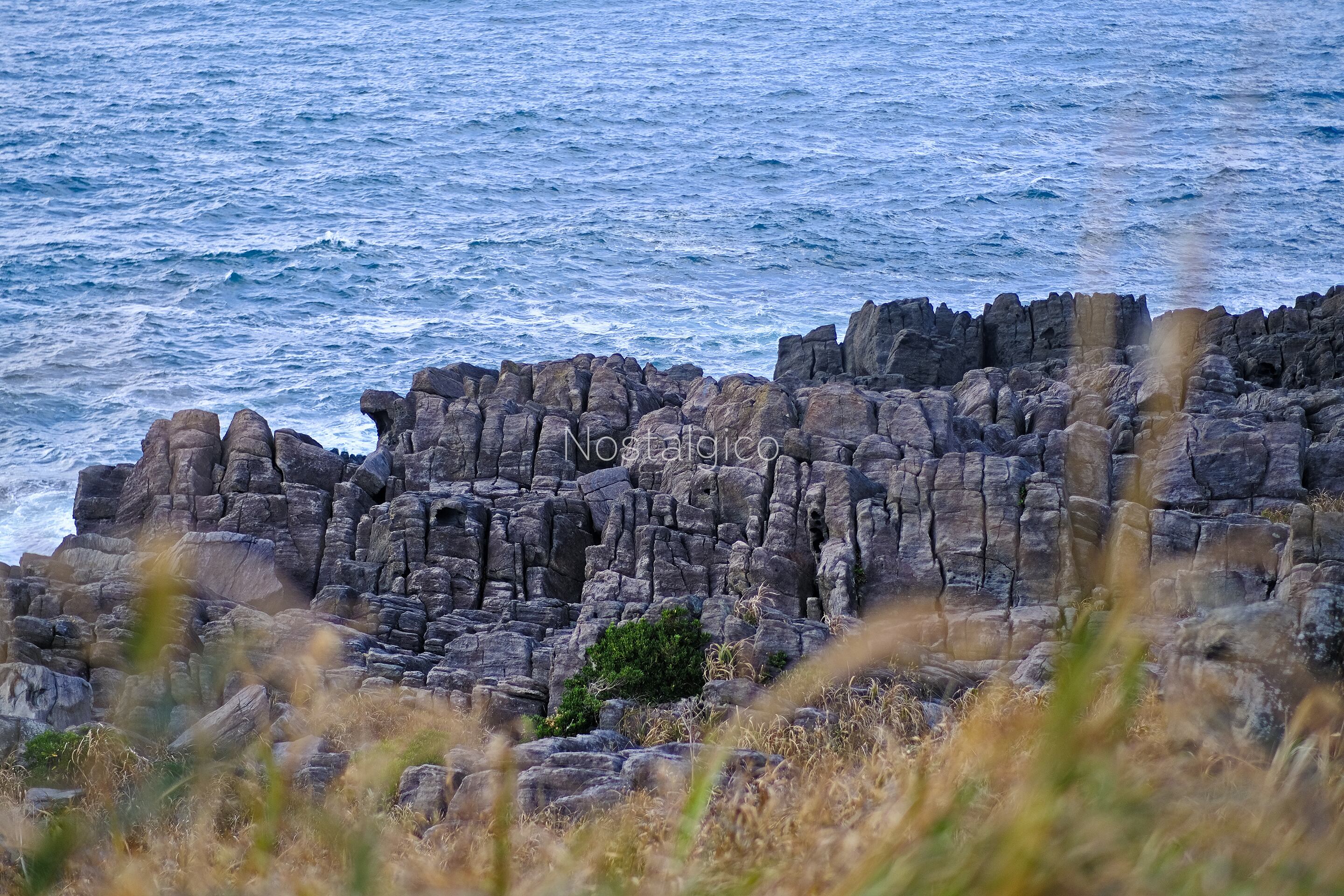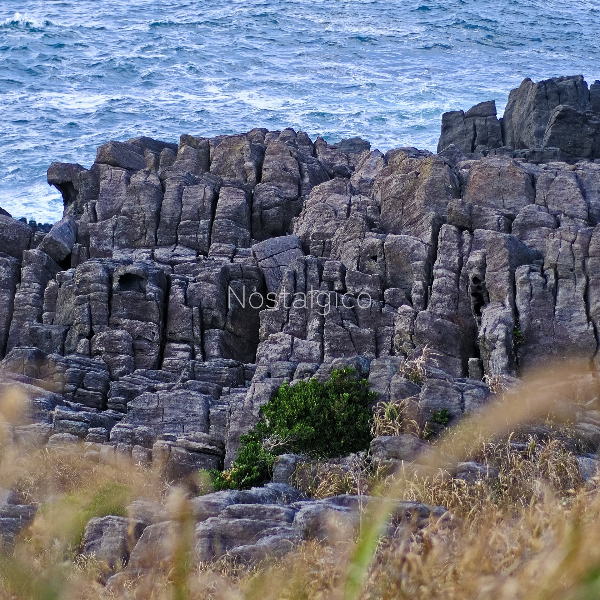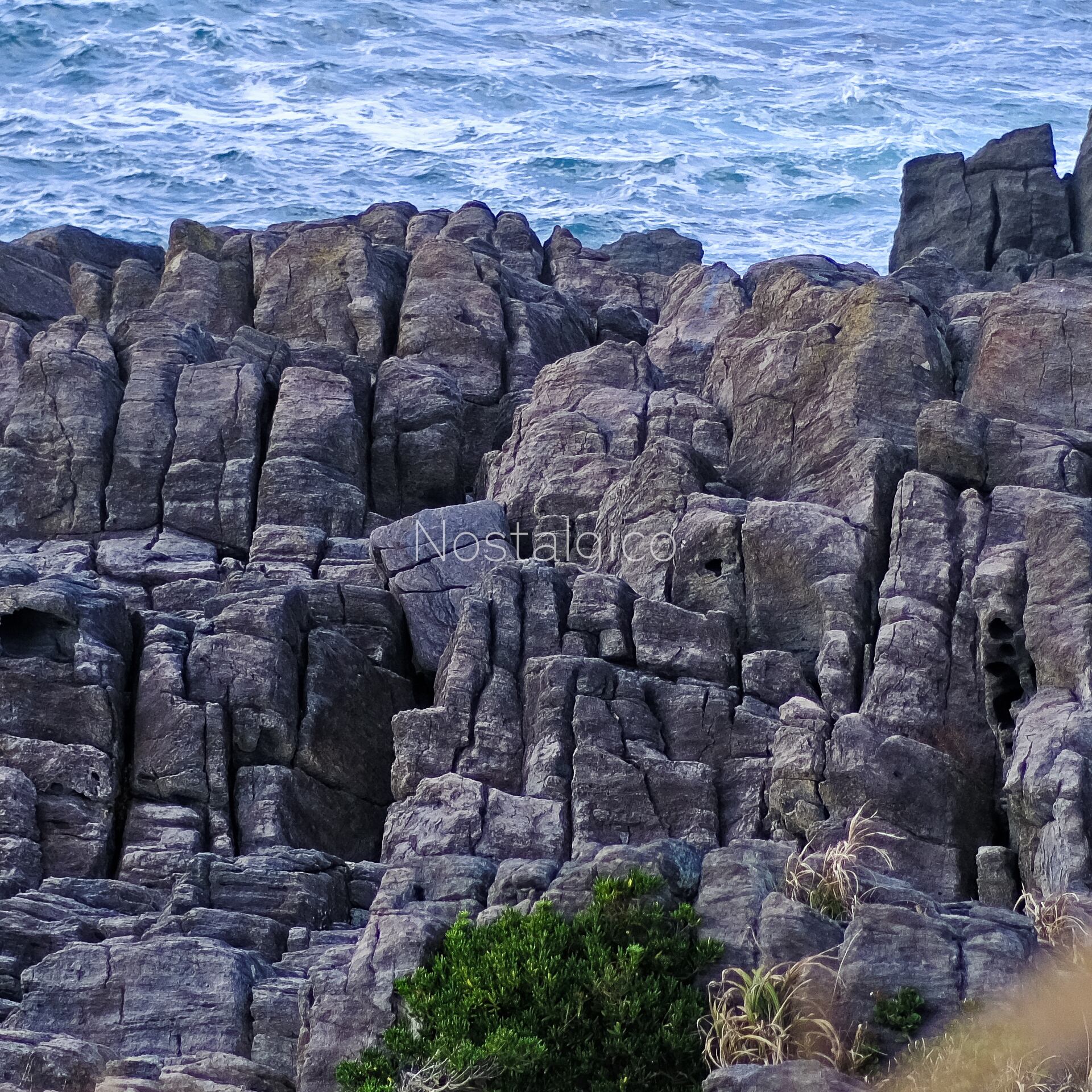 福井県の雄島の海岸の岩場の写真です。海の荒々しい波と湧き出る地下水によって岩に独特の亀裂が生じています。