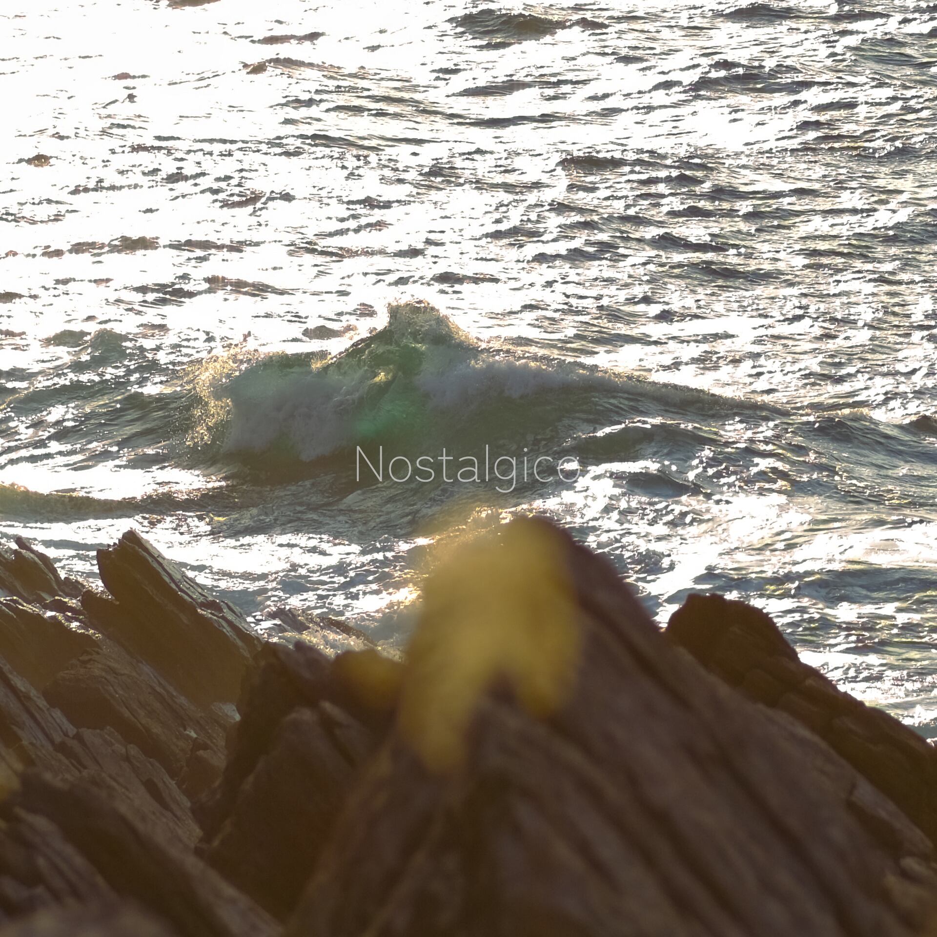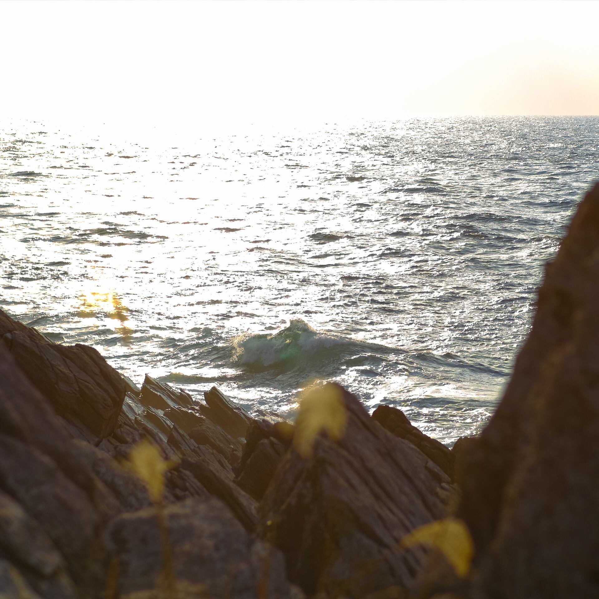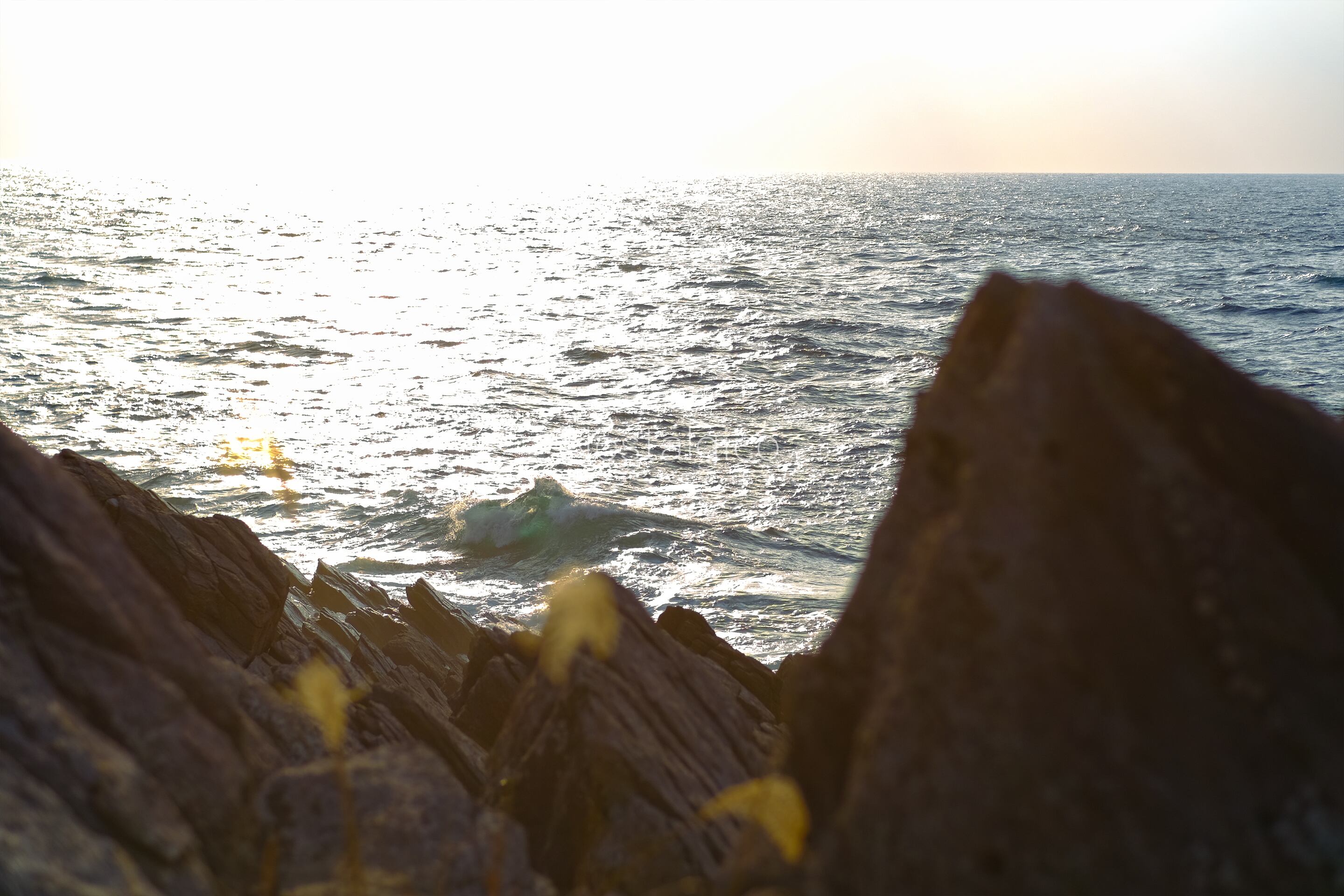 福井県の雄島の夕方の時間帯の海岸の岩場の写真です。海の荒々しい波と湧き出る地下水によって岩に独特の亀裂が生じています。