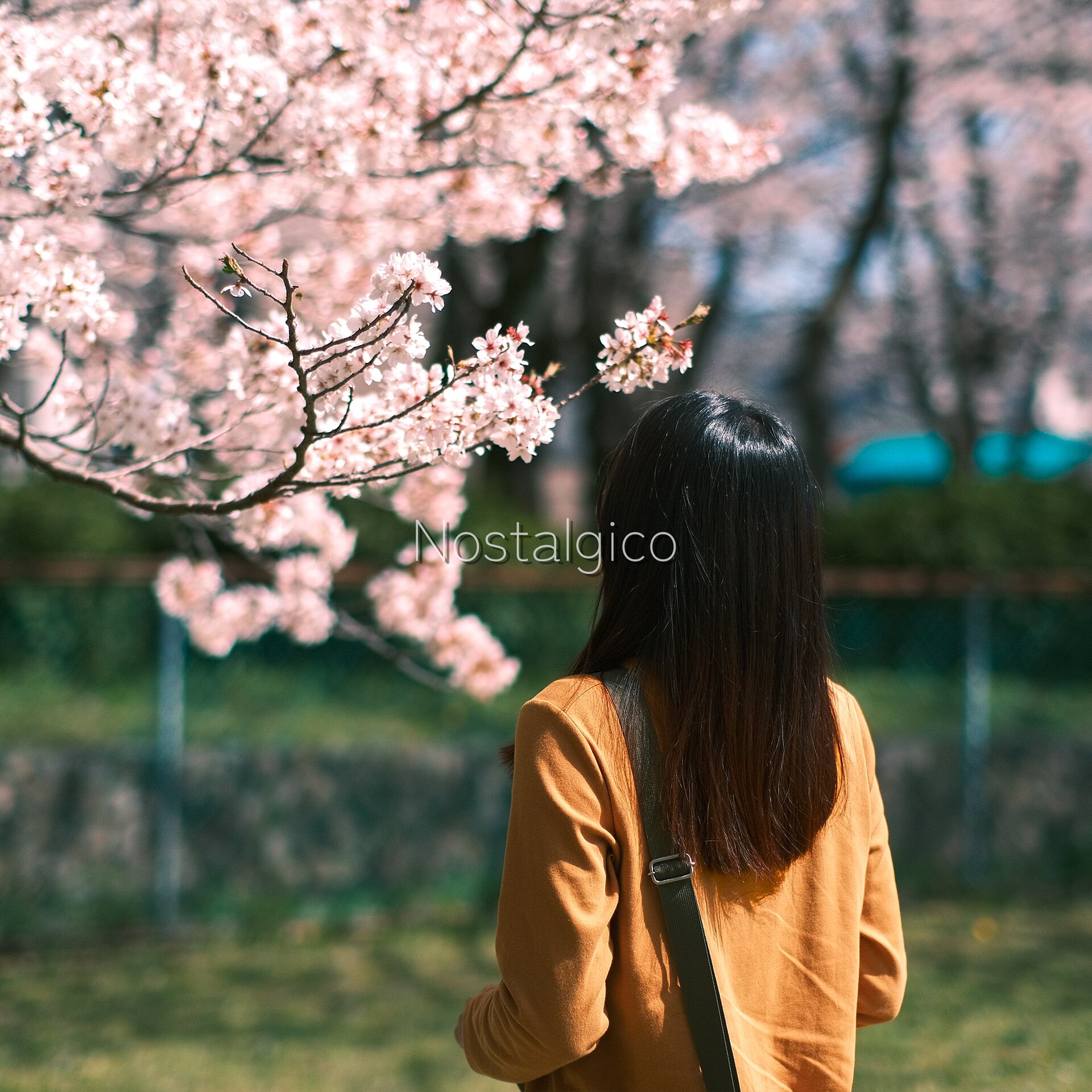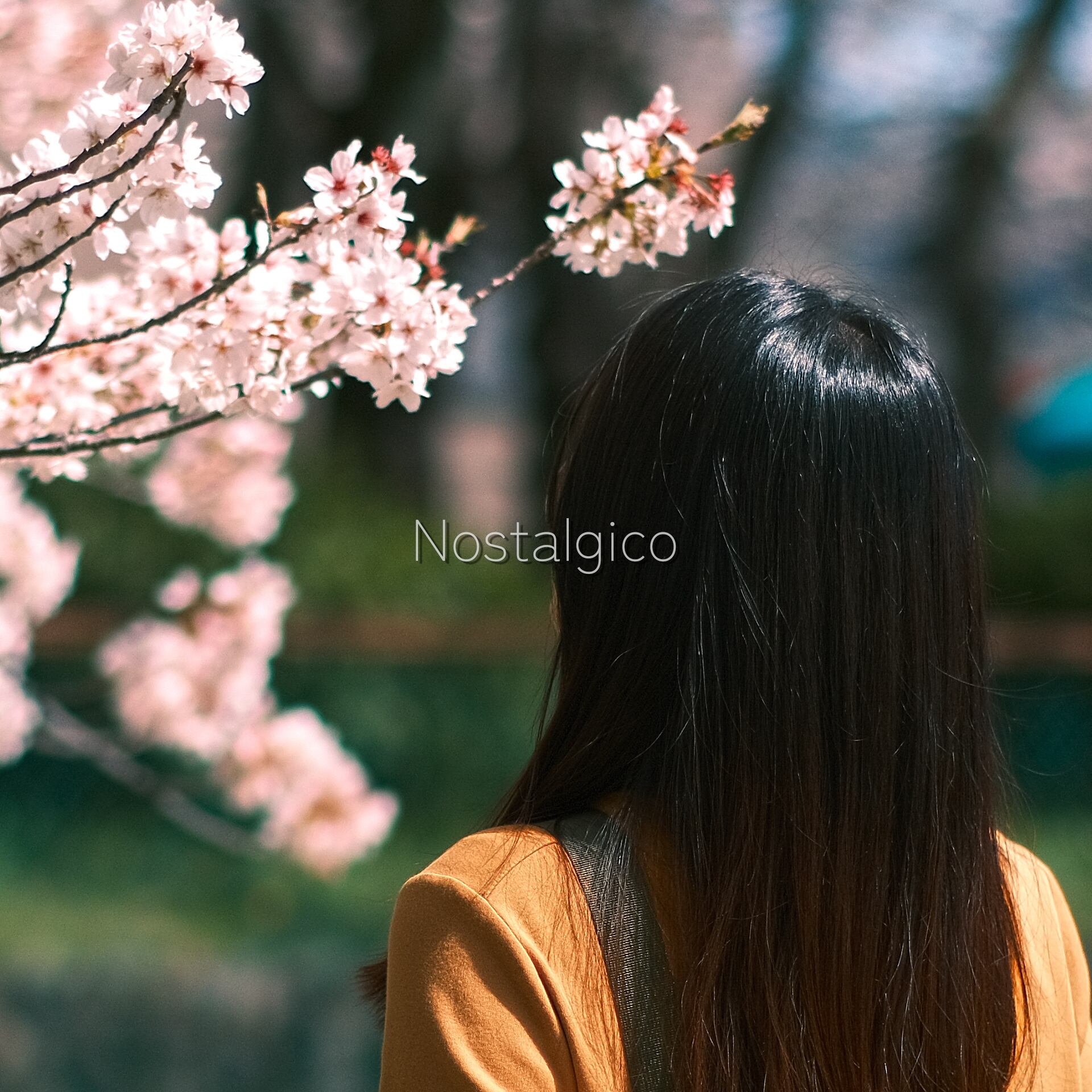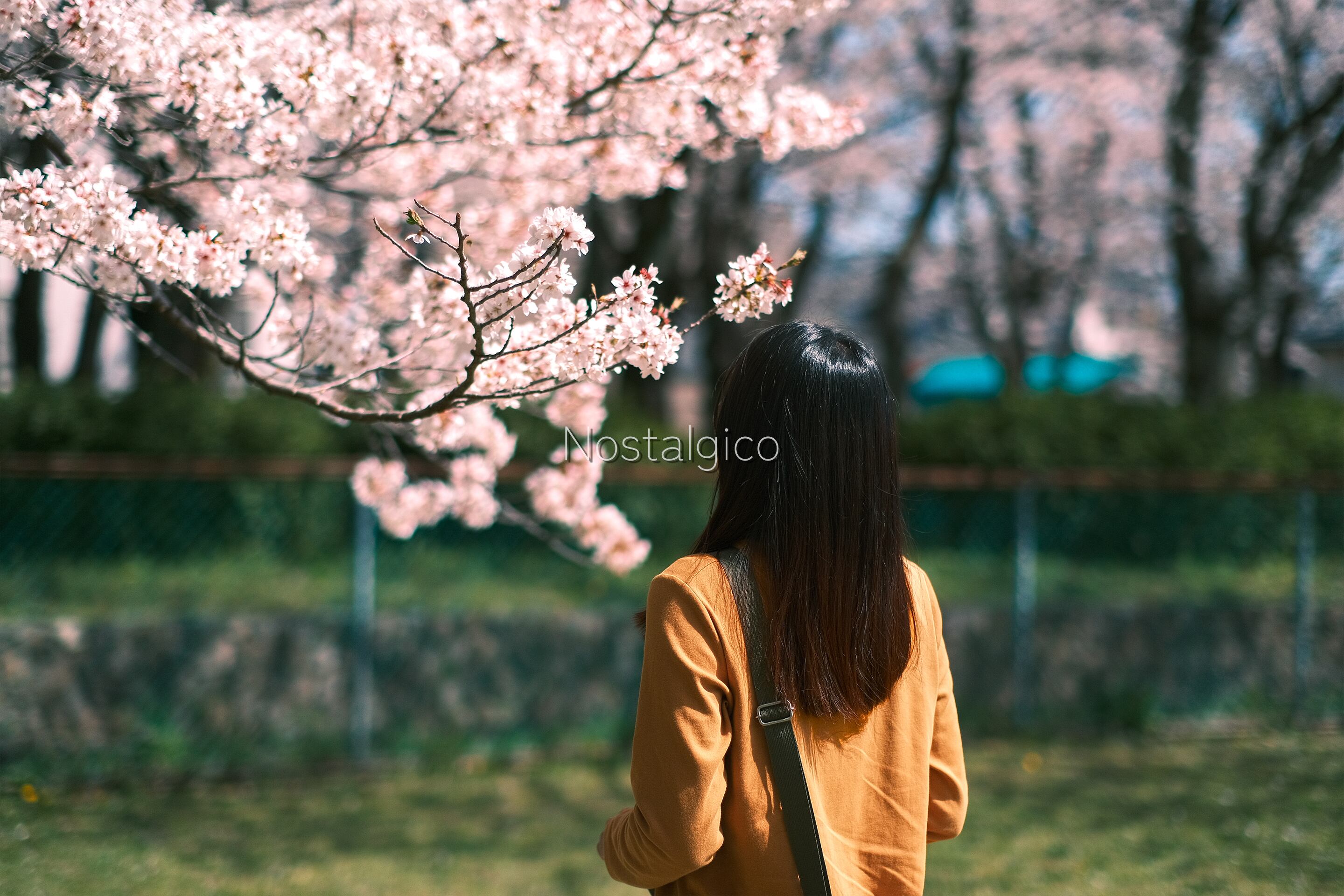 桜の花の香りを楽しむ女性の写真です。春の陽光が桜の花と女性の髪を輝かせています。