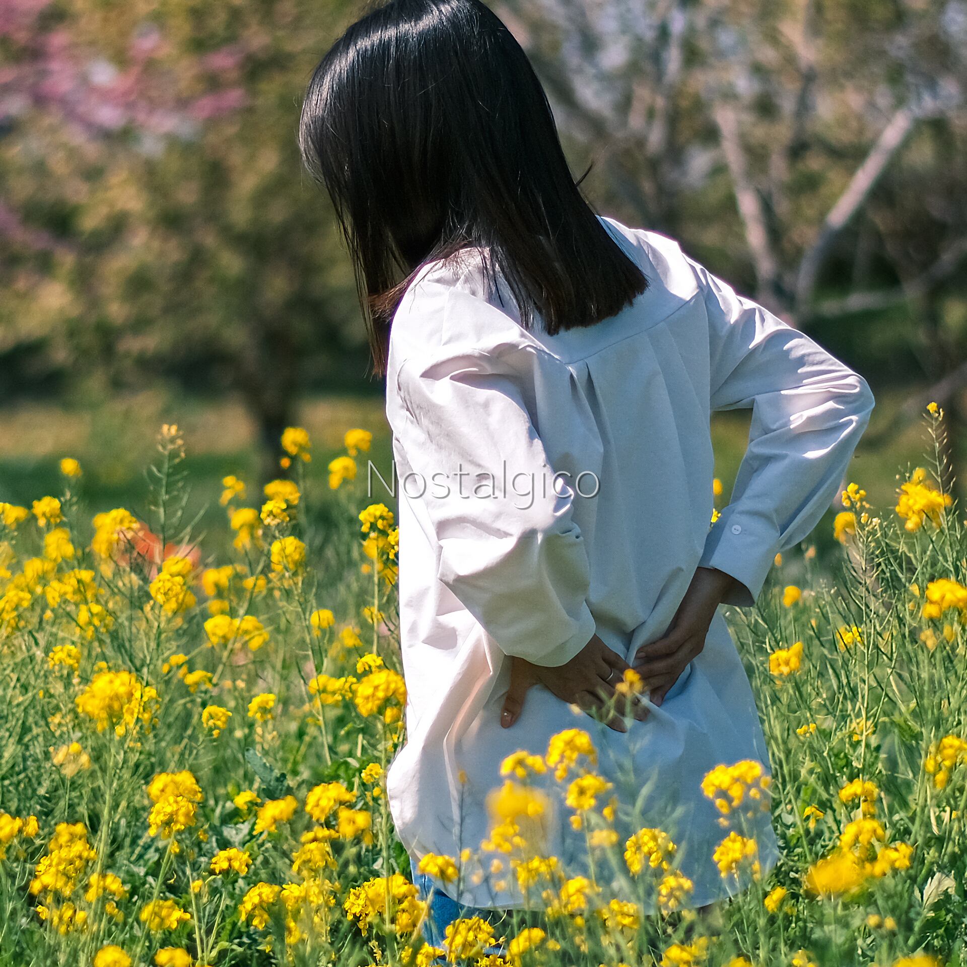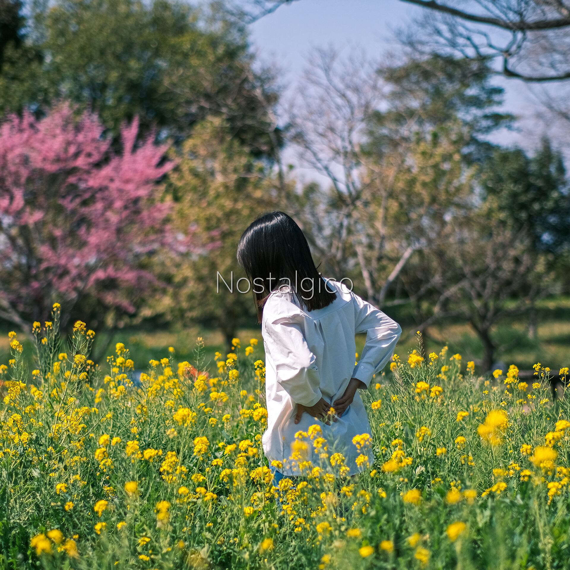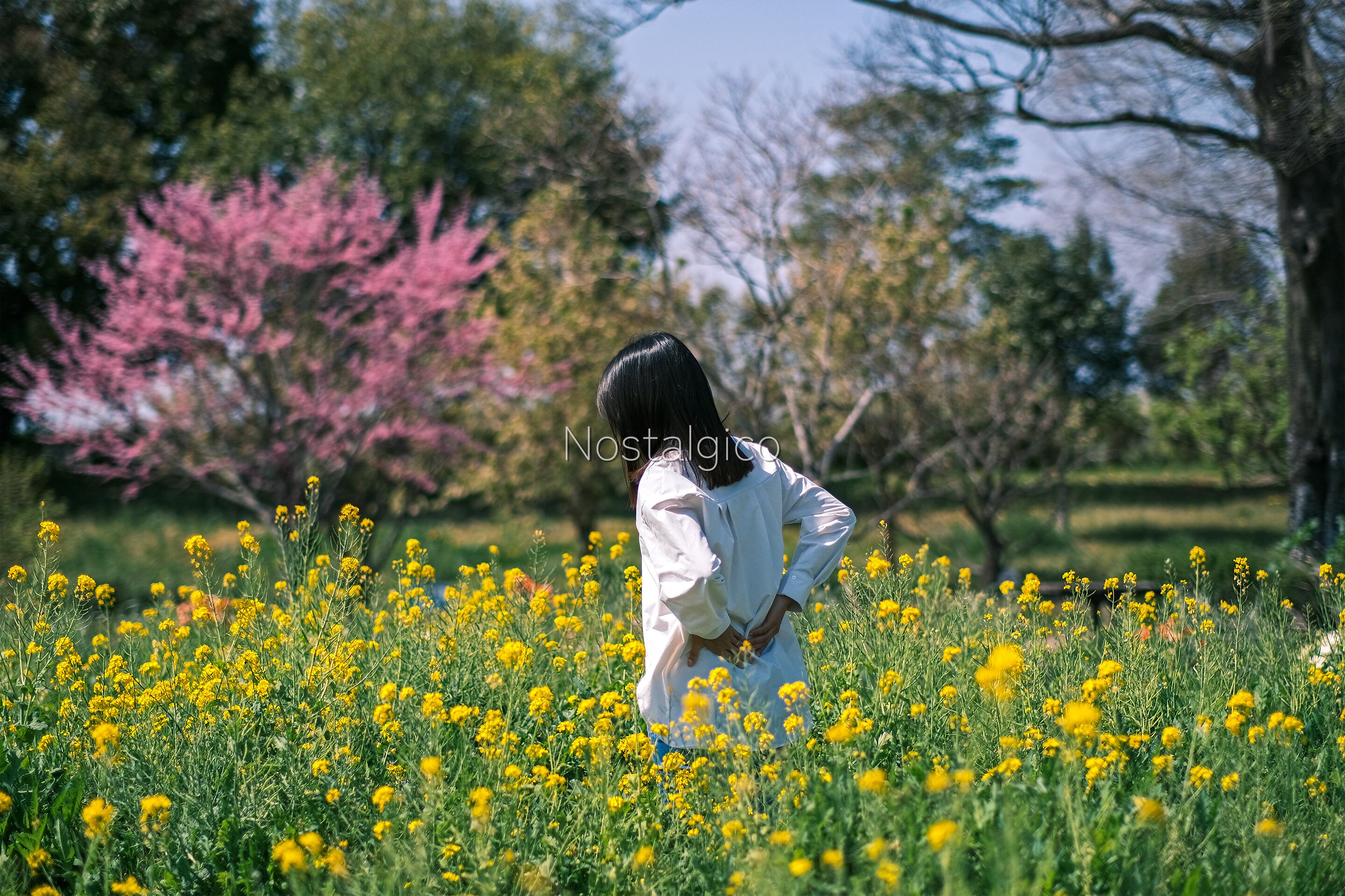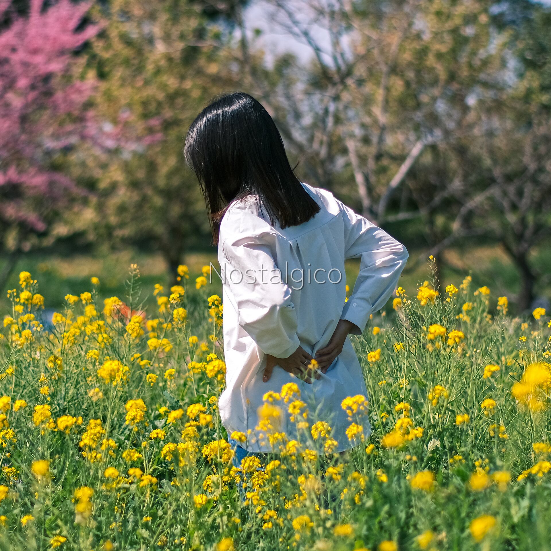 菜の花畑にいる女性の写真素材です。菜の花が広がる春の風景の中で、女性がリラックスして過ごす様子を捉えた一枚です。