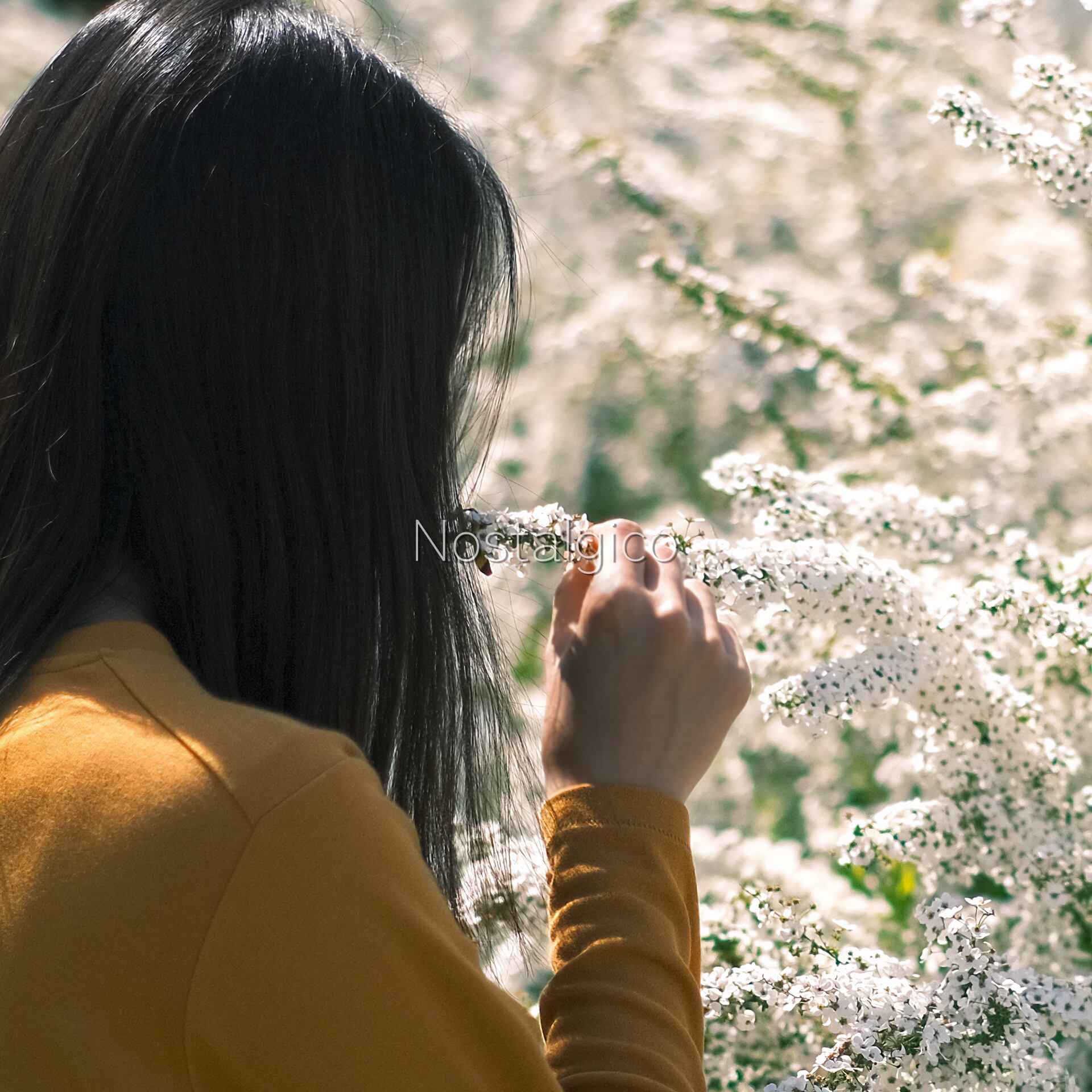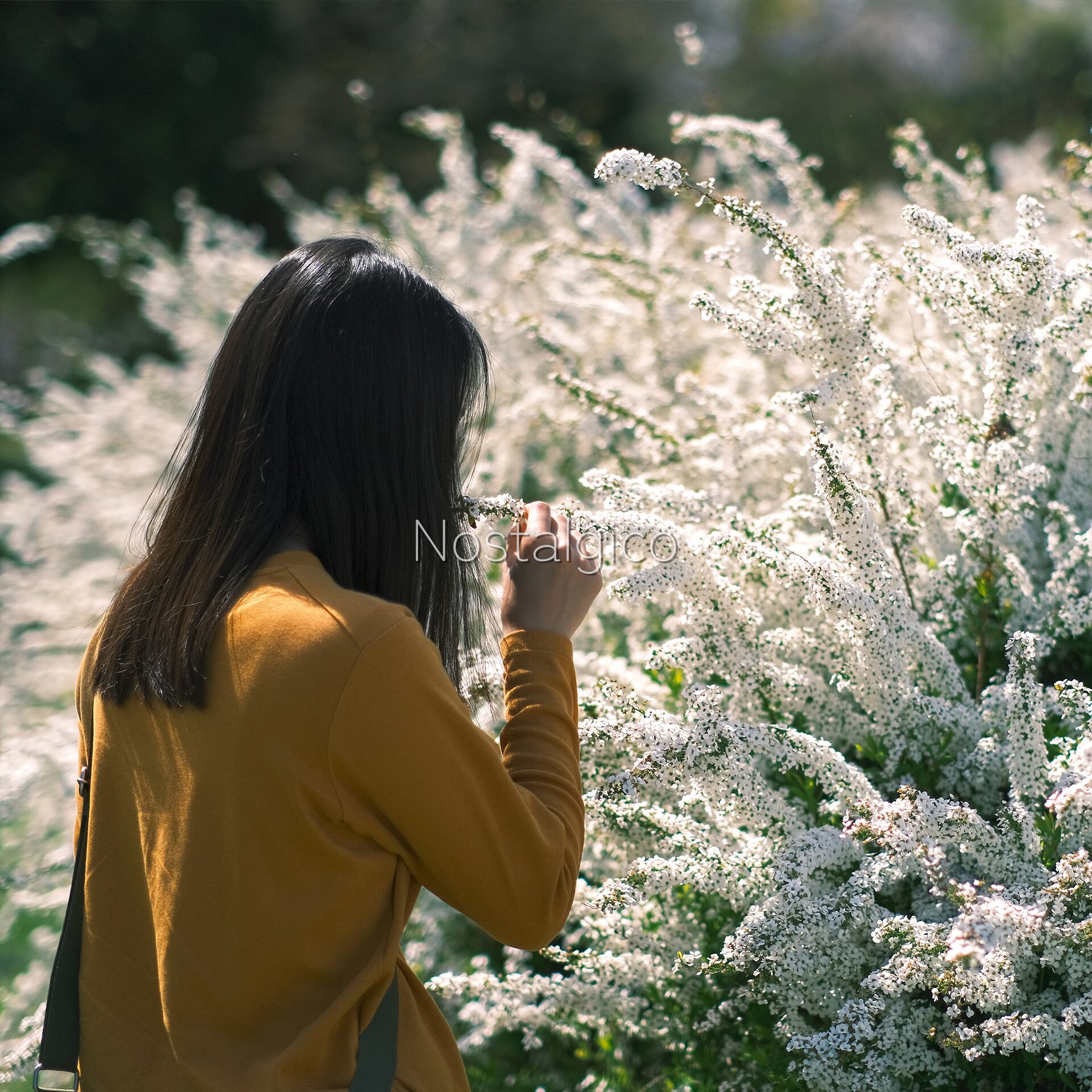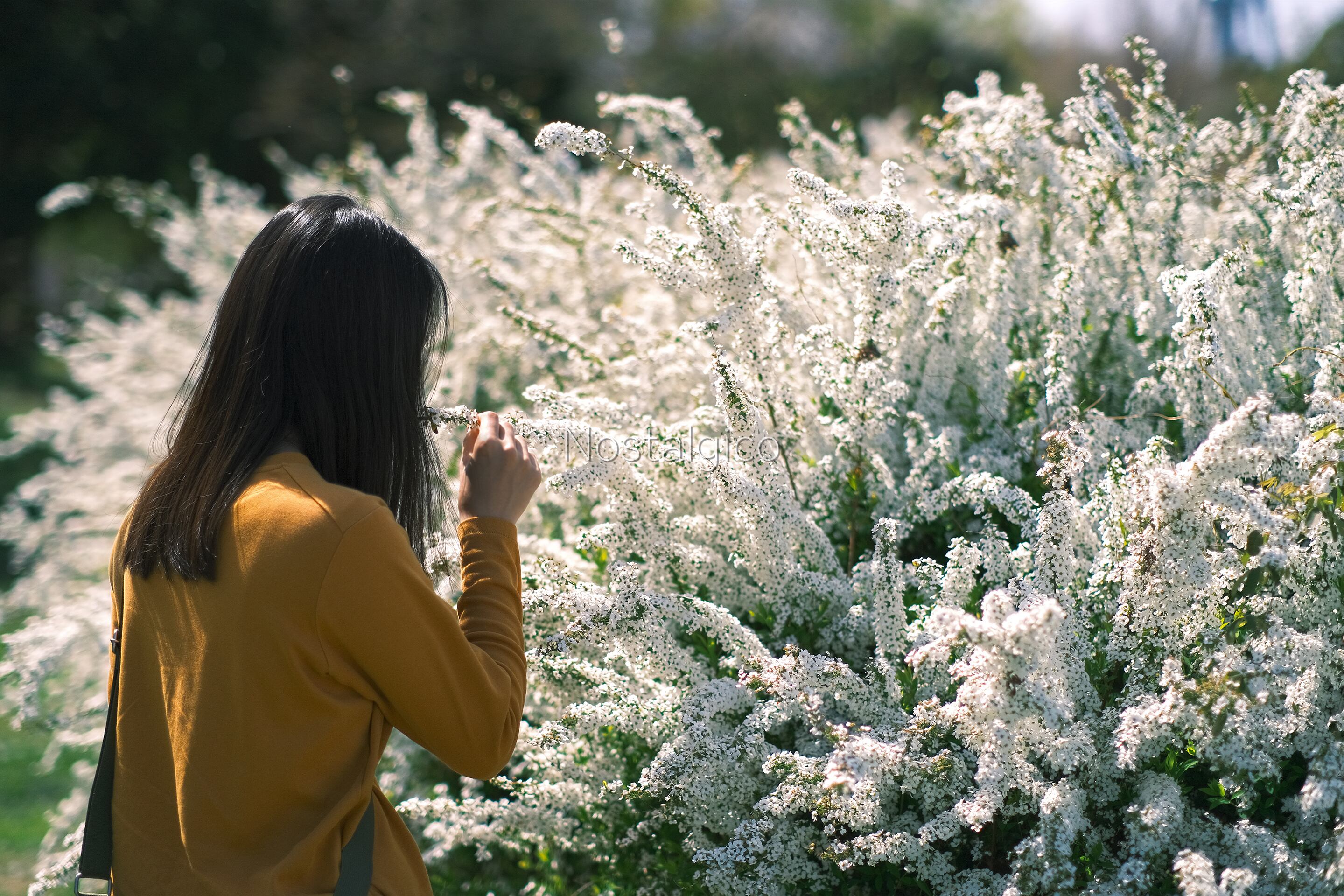 ユキヤナギの香りを楽しむ女性の写真です。春の温かい陽光がユキヤナギの花を輝かせています。