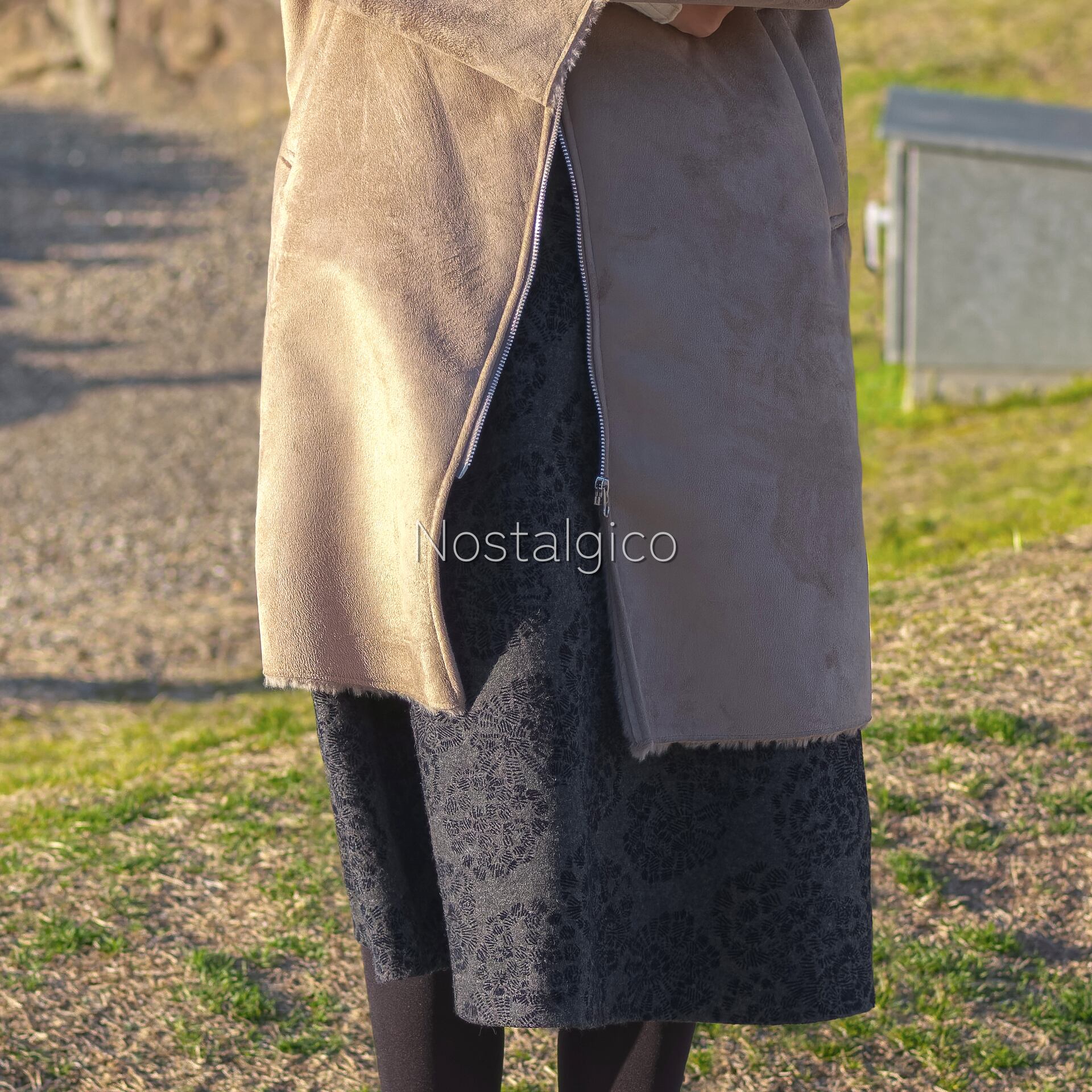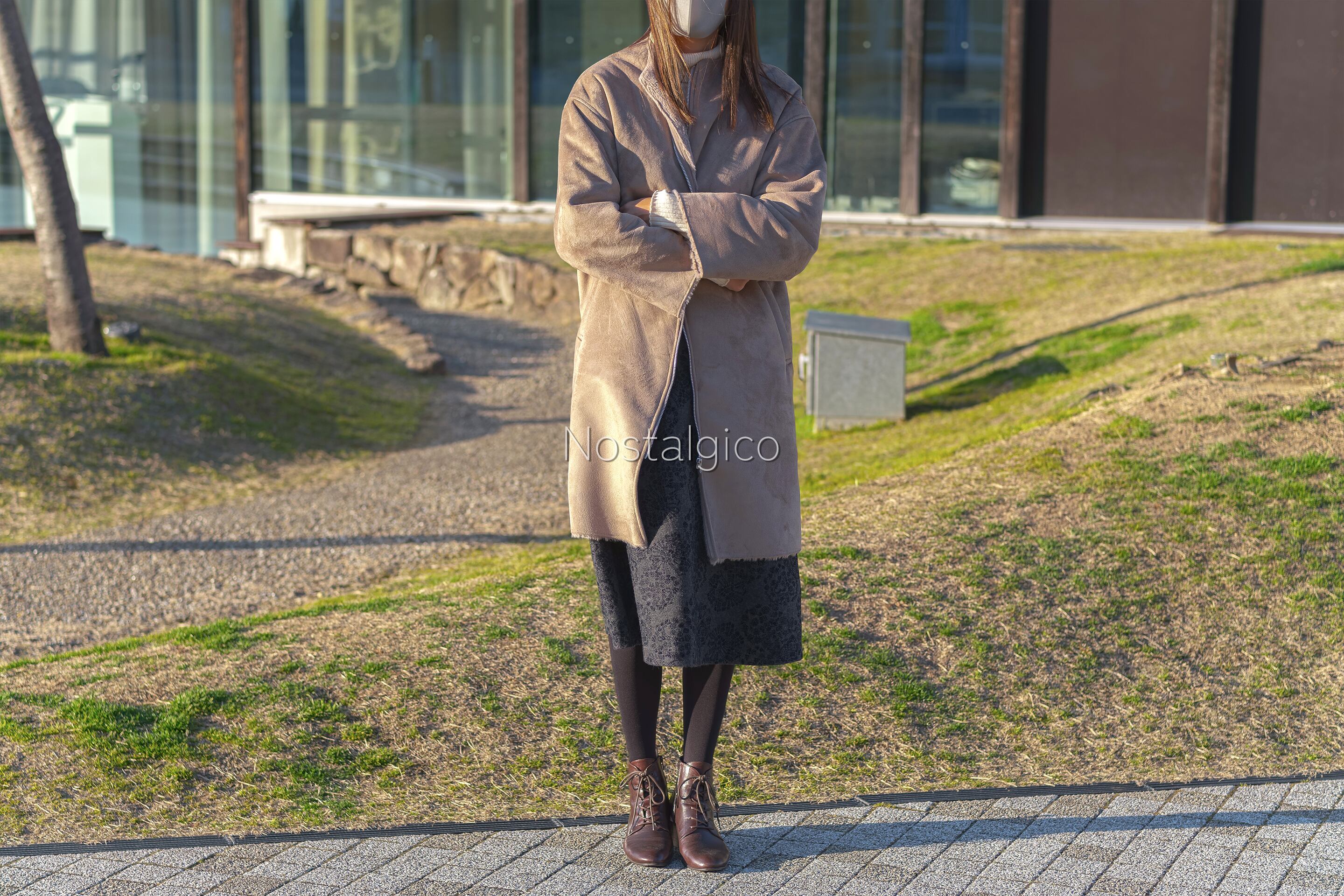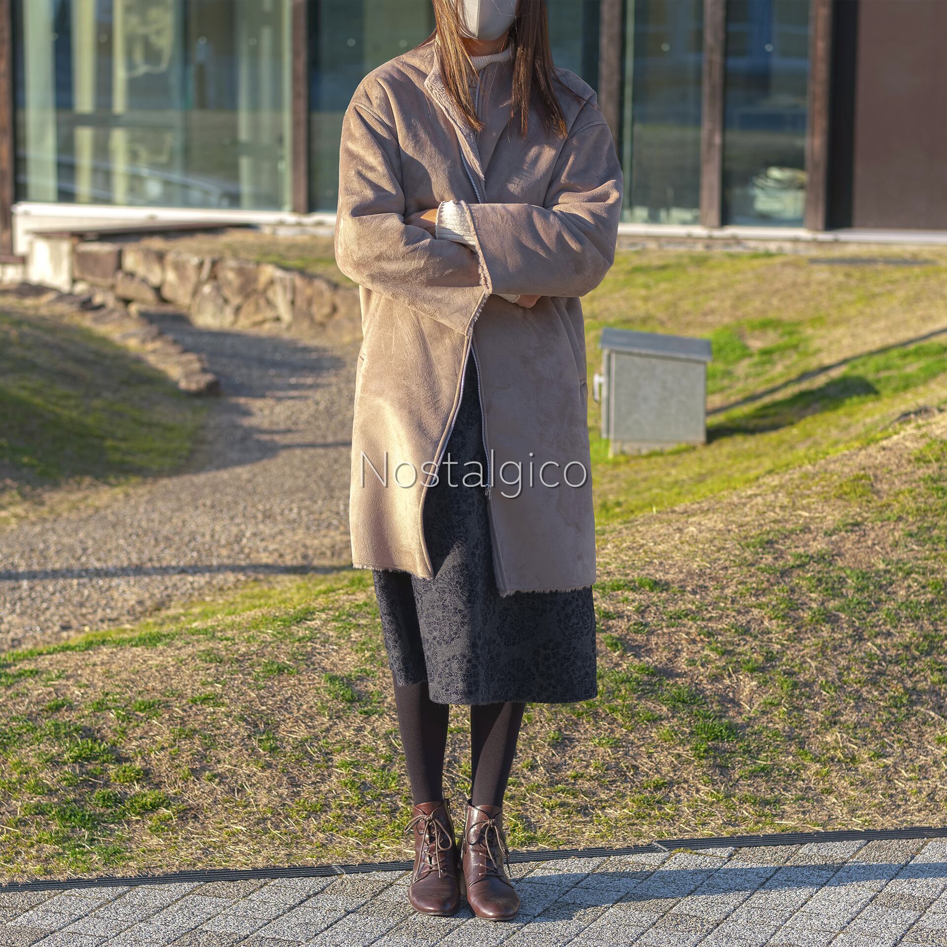 コートを着たちょっと寒そうにしている女性の写真素材です。冬コーデのZIPコートのミドル丈を使用していて生地はフェイクファーです。