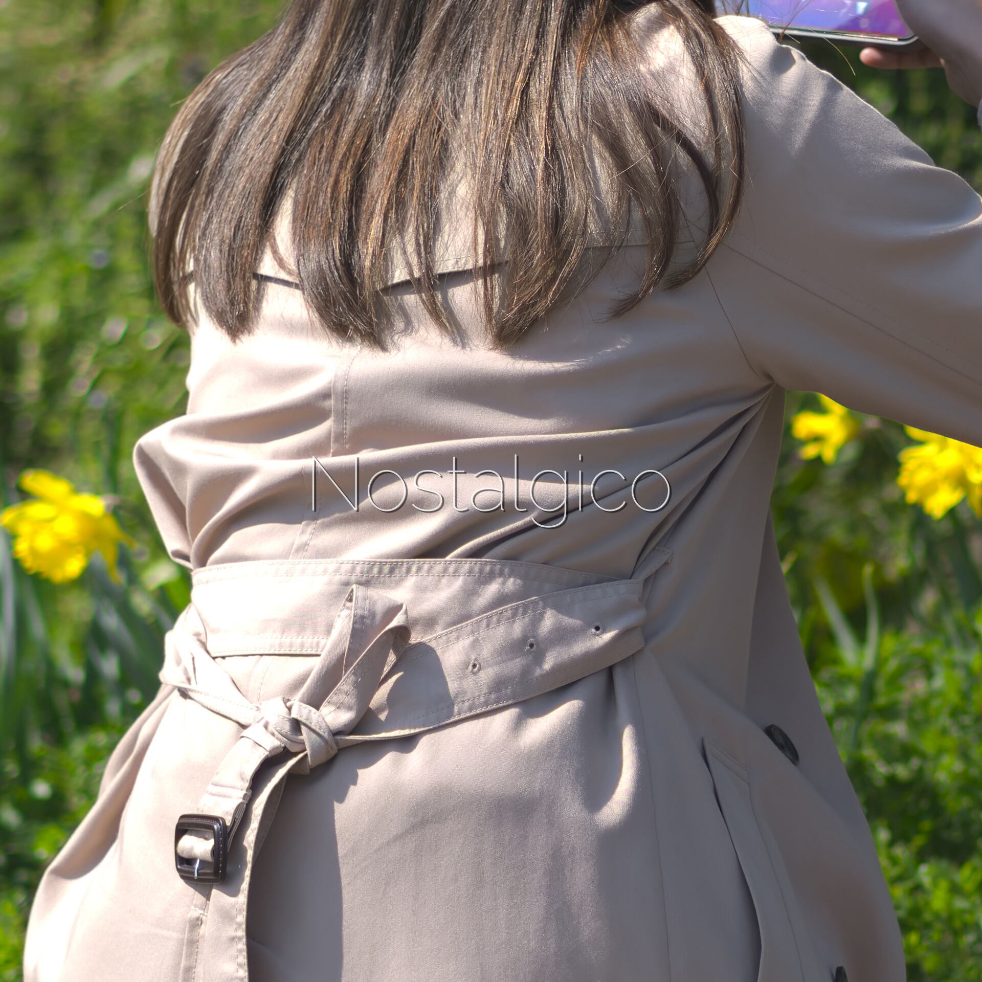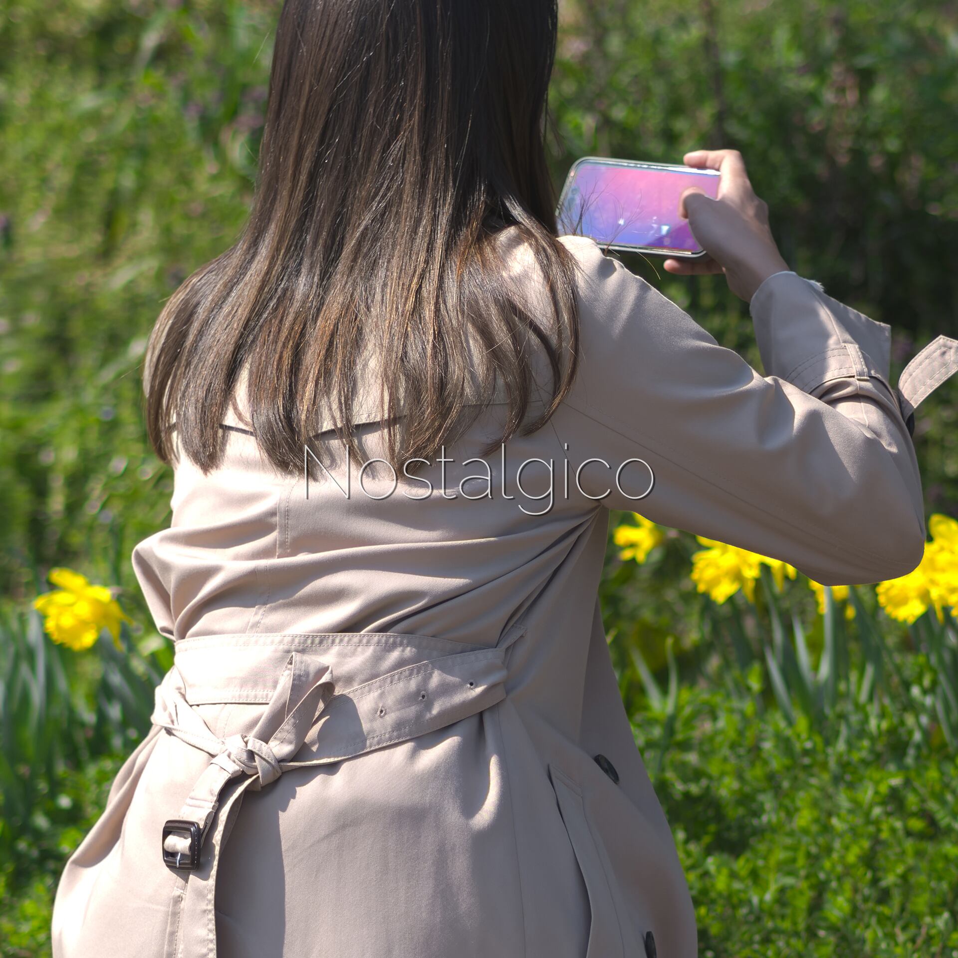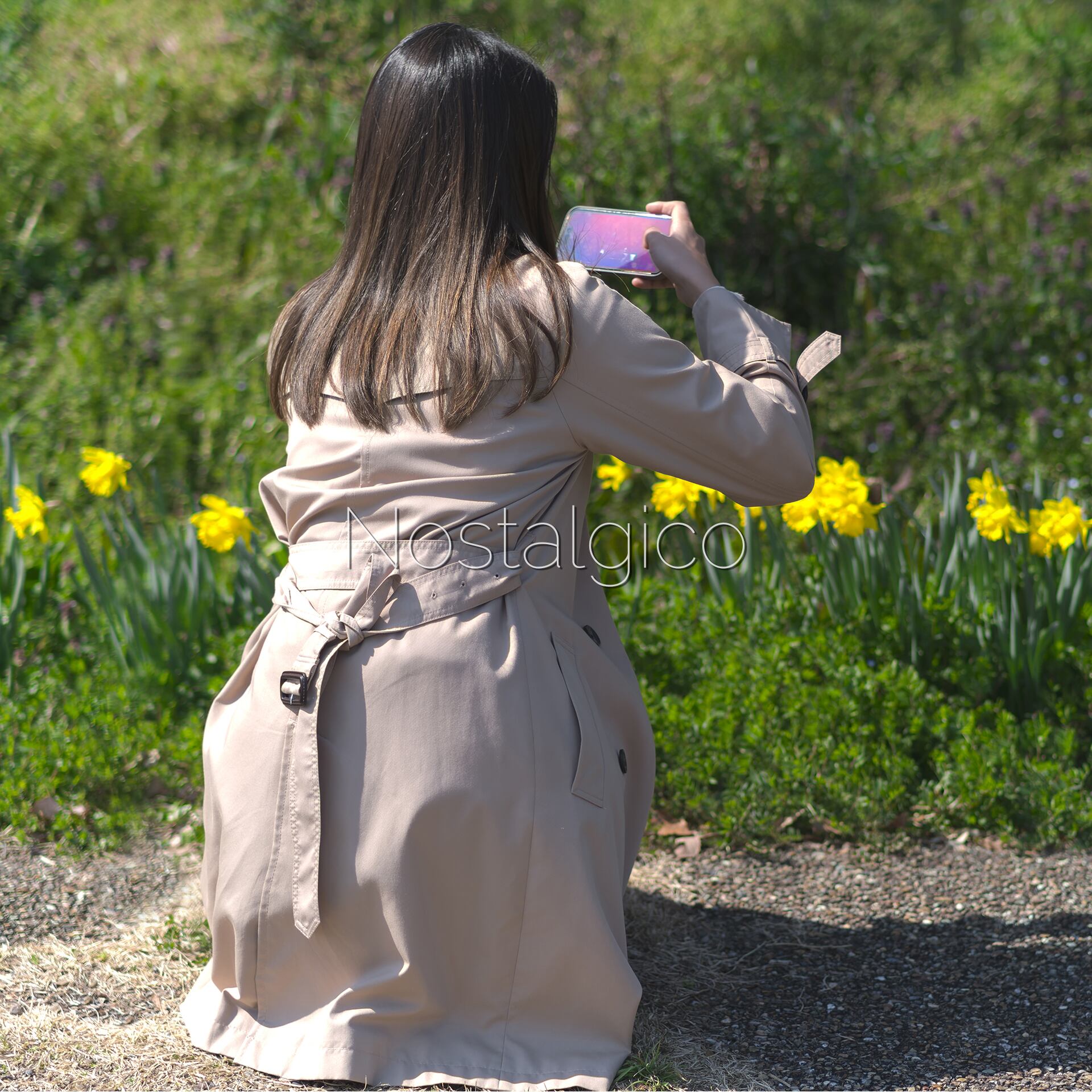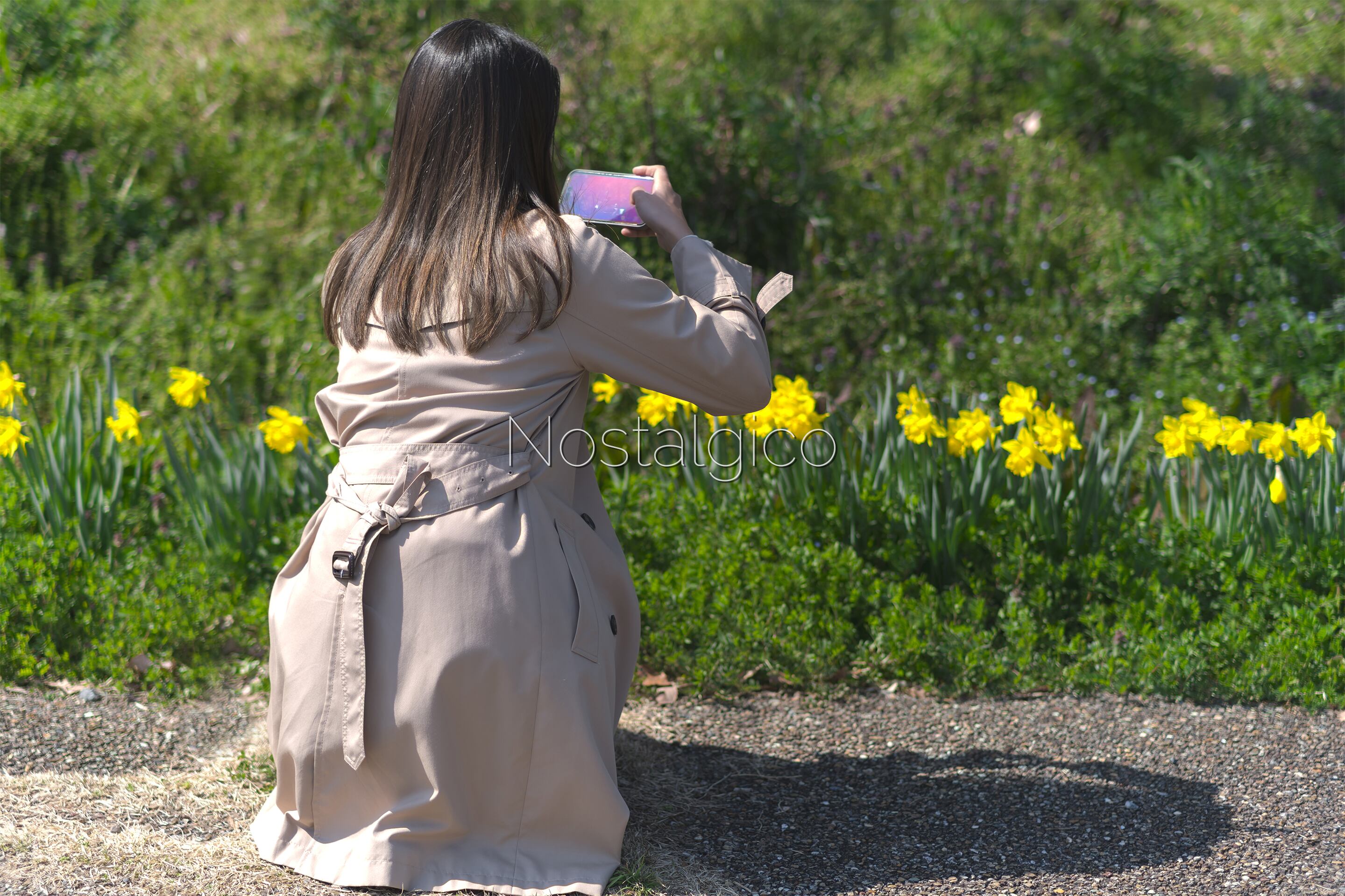 春のスイセンの花の写真を撮っているトレンチコートを着た女性の写真素材です。公園に咲いたスイセンの花と、女性のエレガントなトレンチコートが春の季節感を醸し出しています。