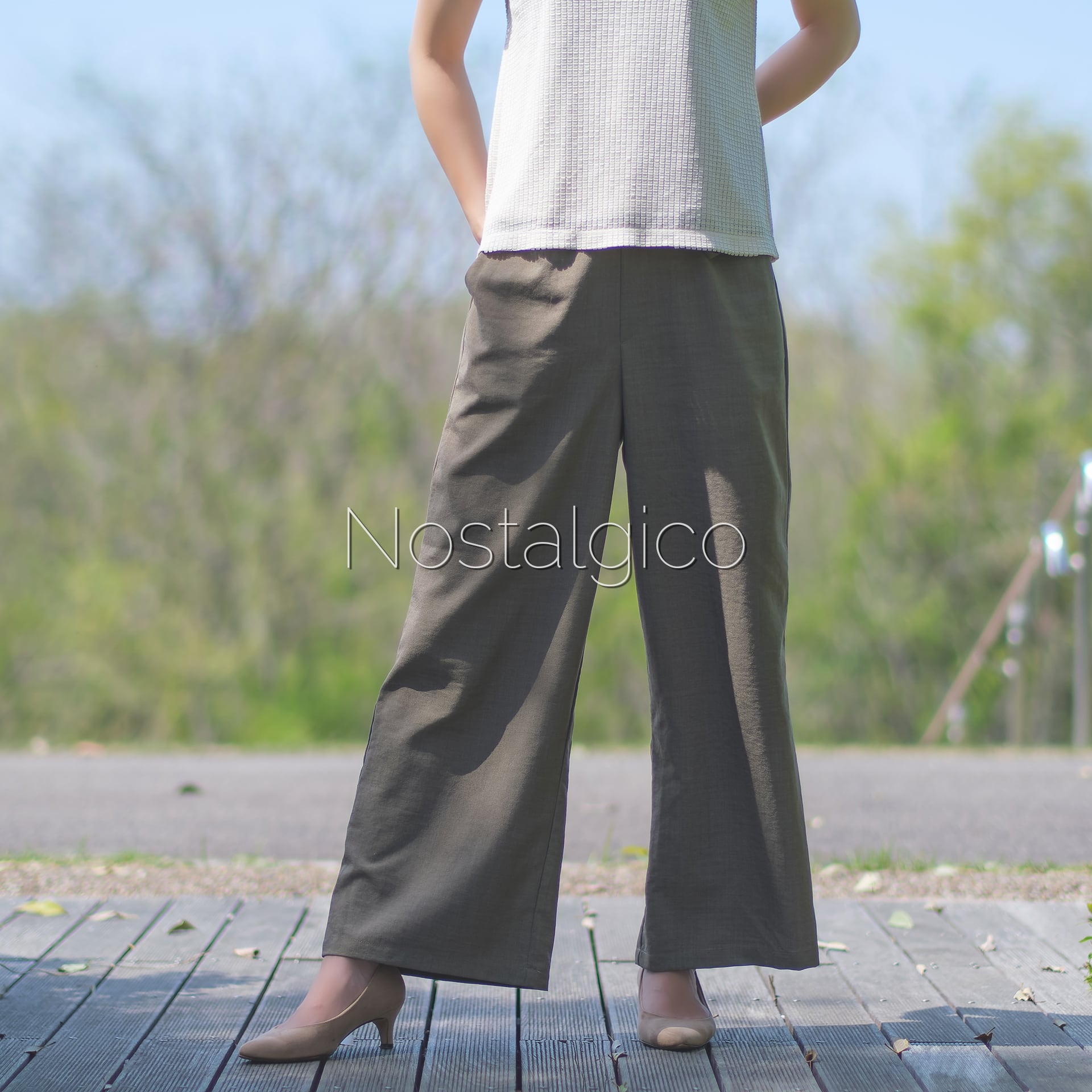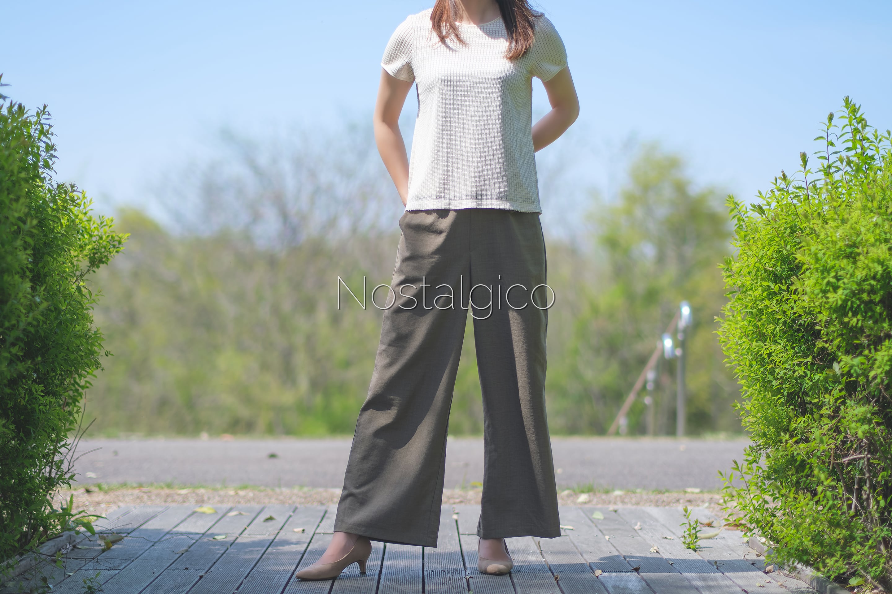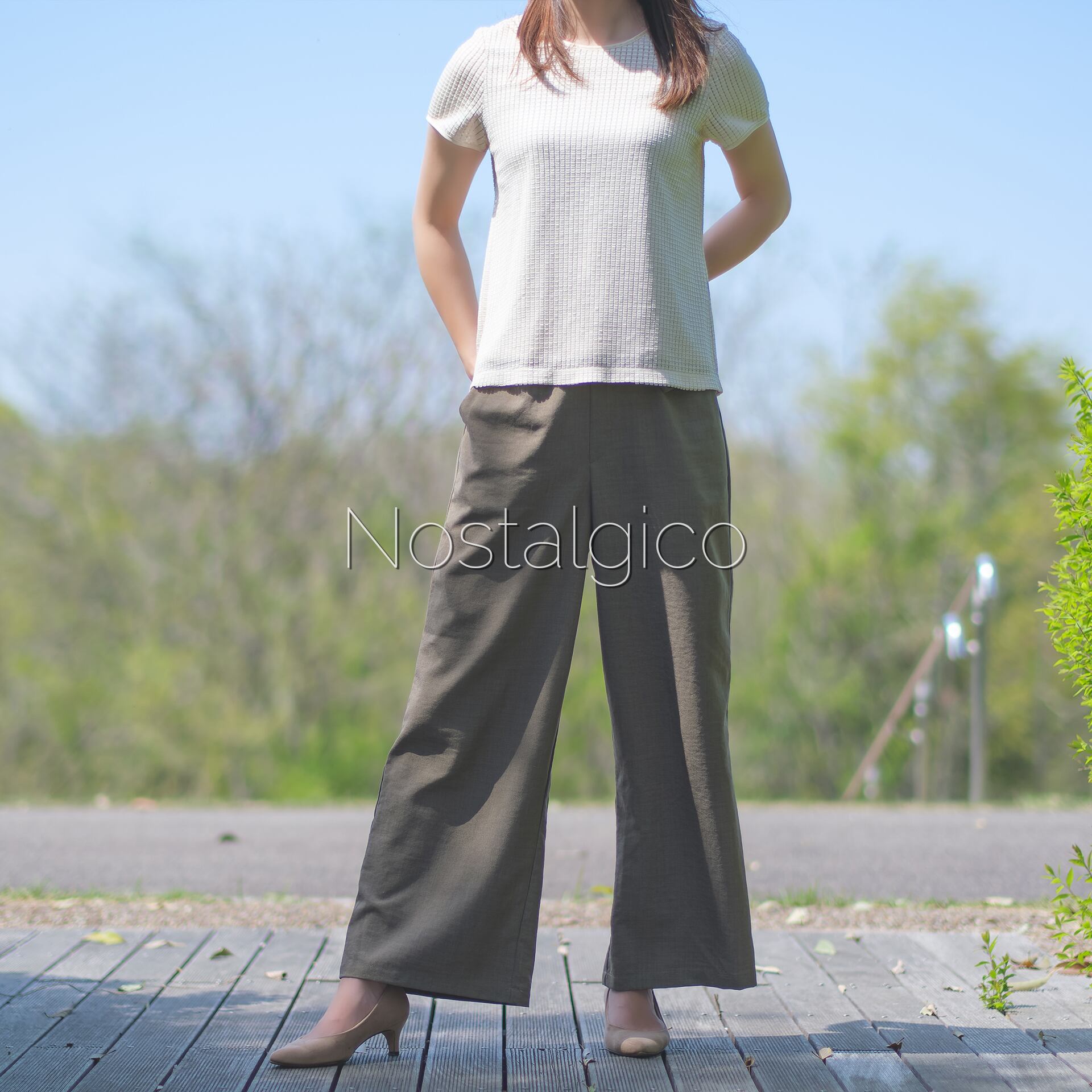 ワイドパンツの写真素材。ワイドパンツのシルエットから、開放感やゆったりとした雰囲気が伝わってきます。