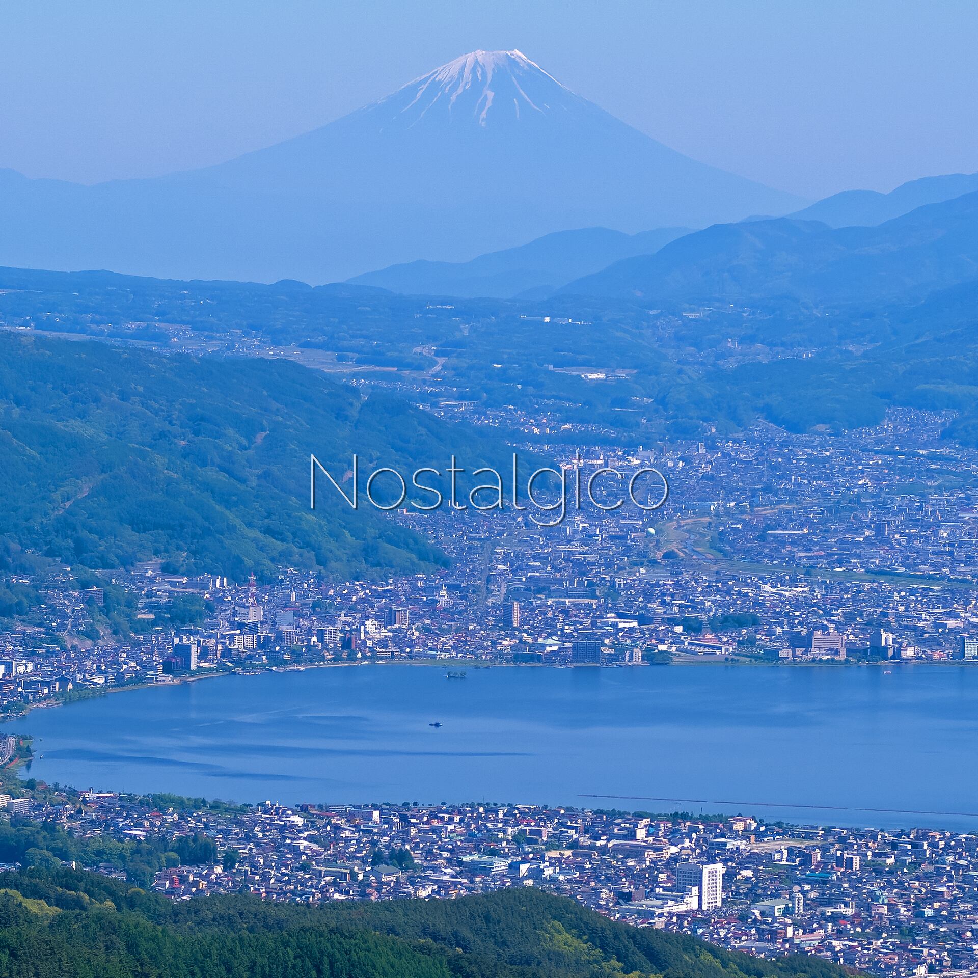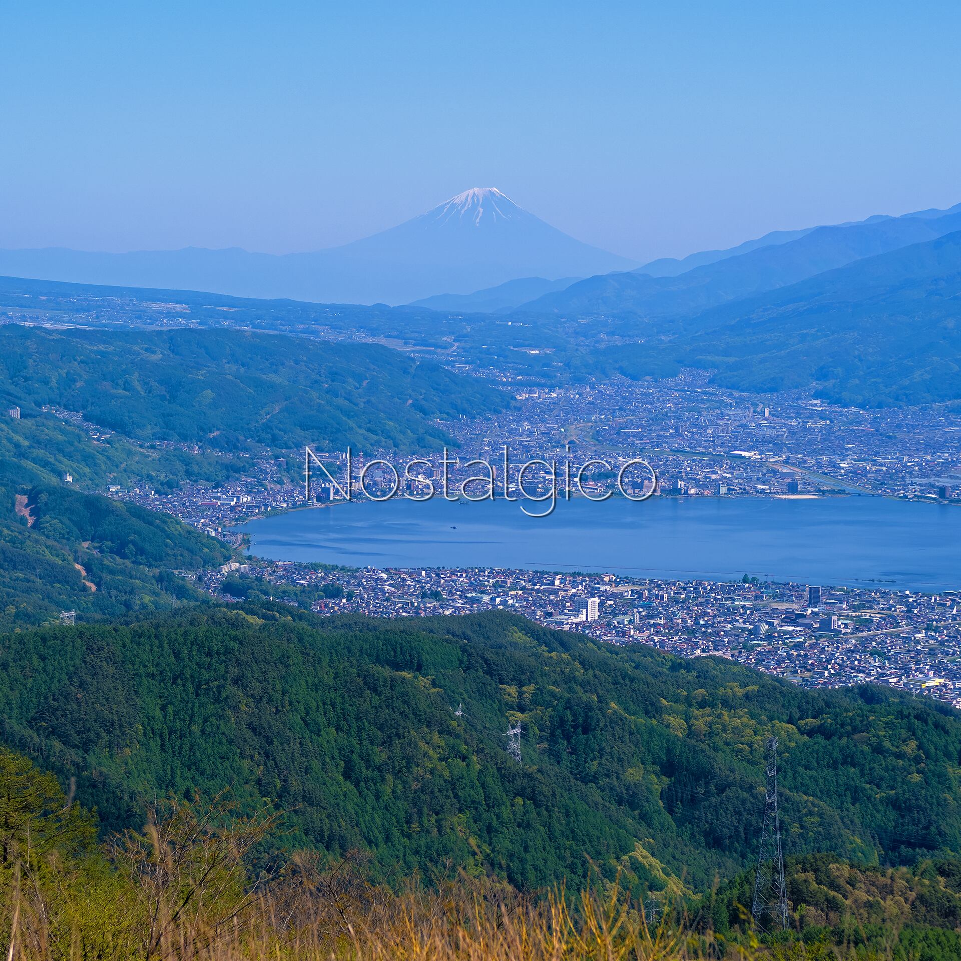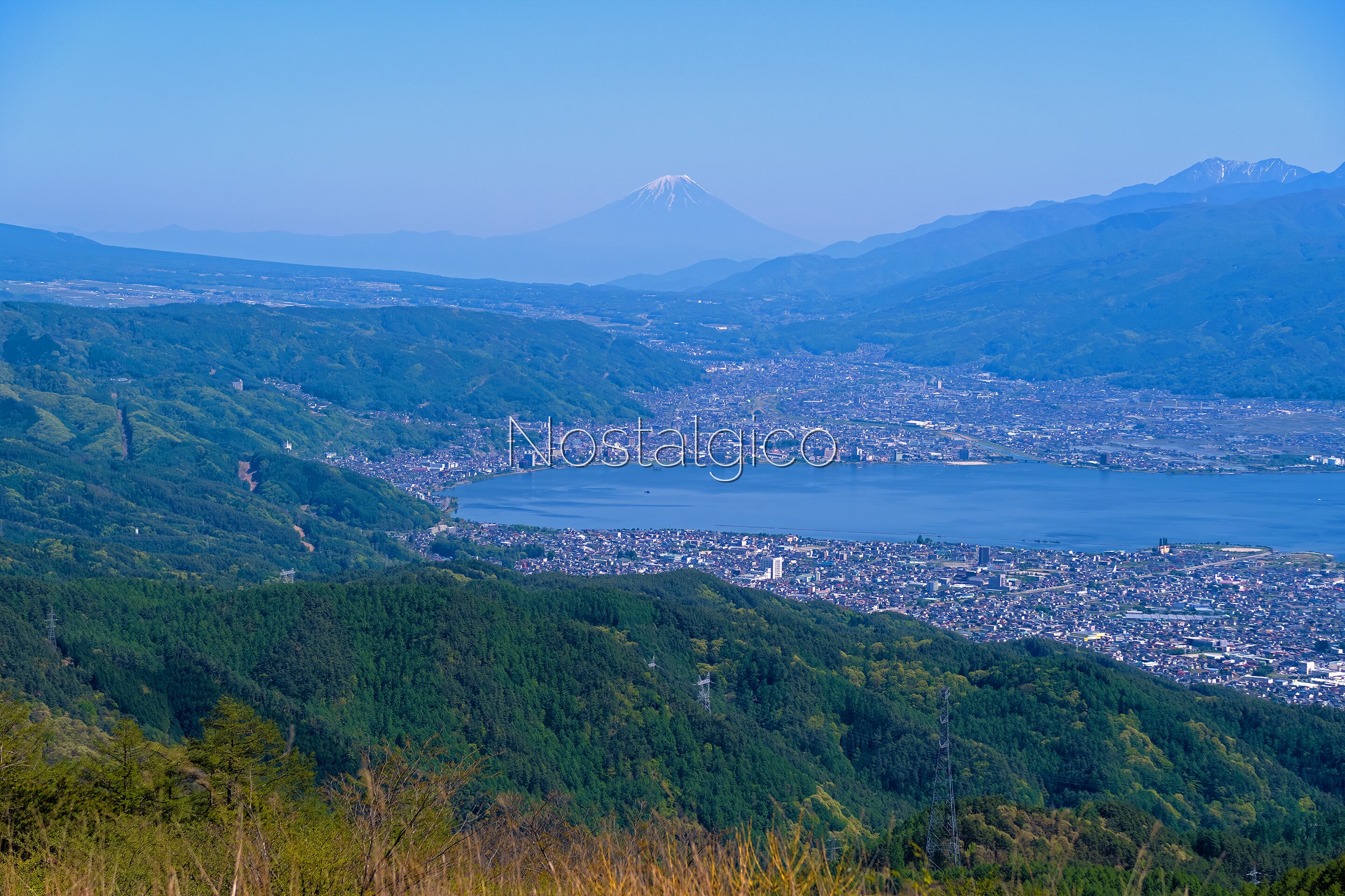 長野県の美しい高ボッチ高原から望む景色を切り取った写真素材です。諏訪湖や周囲の街並み、そして遠くに広がる壮大な富士山の姿をお楽しみいただけます。