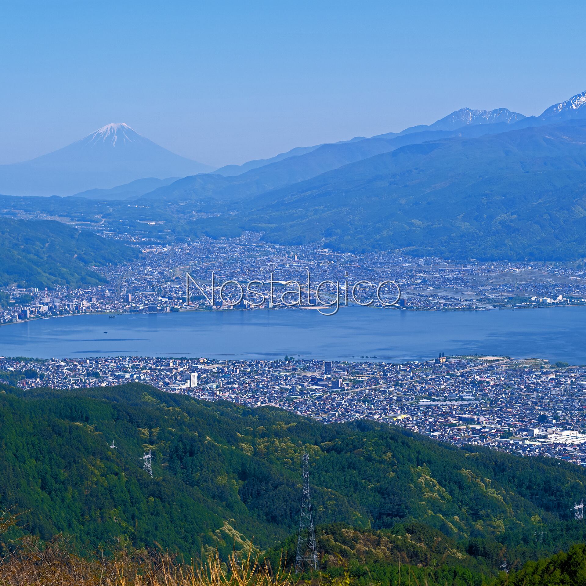 長野県の美しい高ボッチ高原から望む景色を切り取った写真素材です。諏訪湖や周囲の街並み、そして遠くに広がる壮大な富士山の姿をお楽しみいただけます。