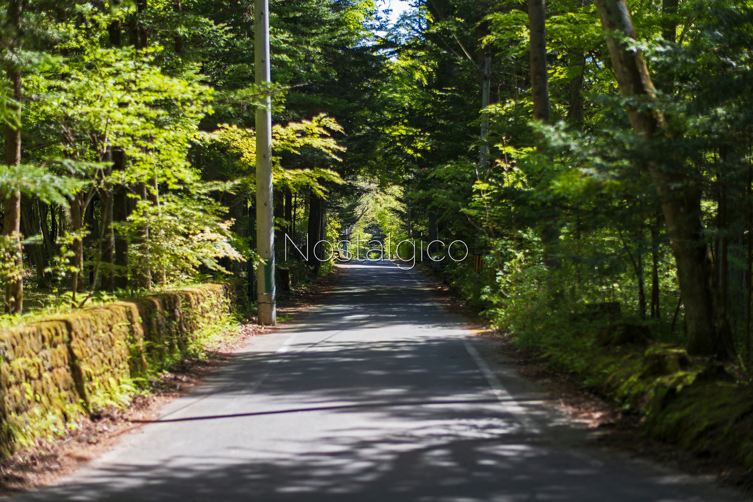 木漏れ日にキラキラ輝く木々のトンネルが続く軽井沢の散歩道を写真に収めました。静寂と美しさが溢れるこの風景は、心を穏やかにし、日々の生活から離れたくなるような魅力があります。